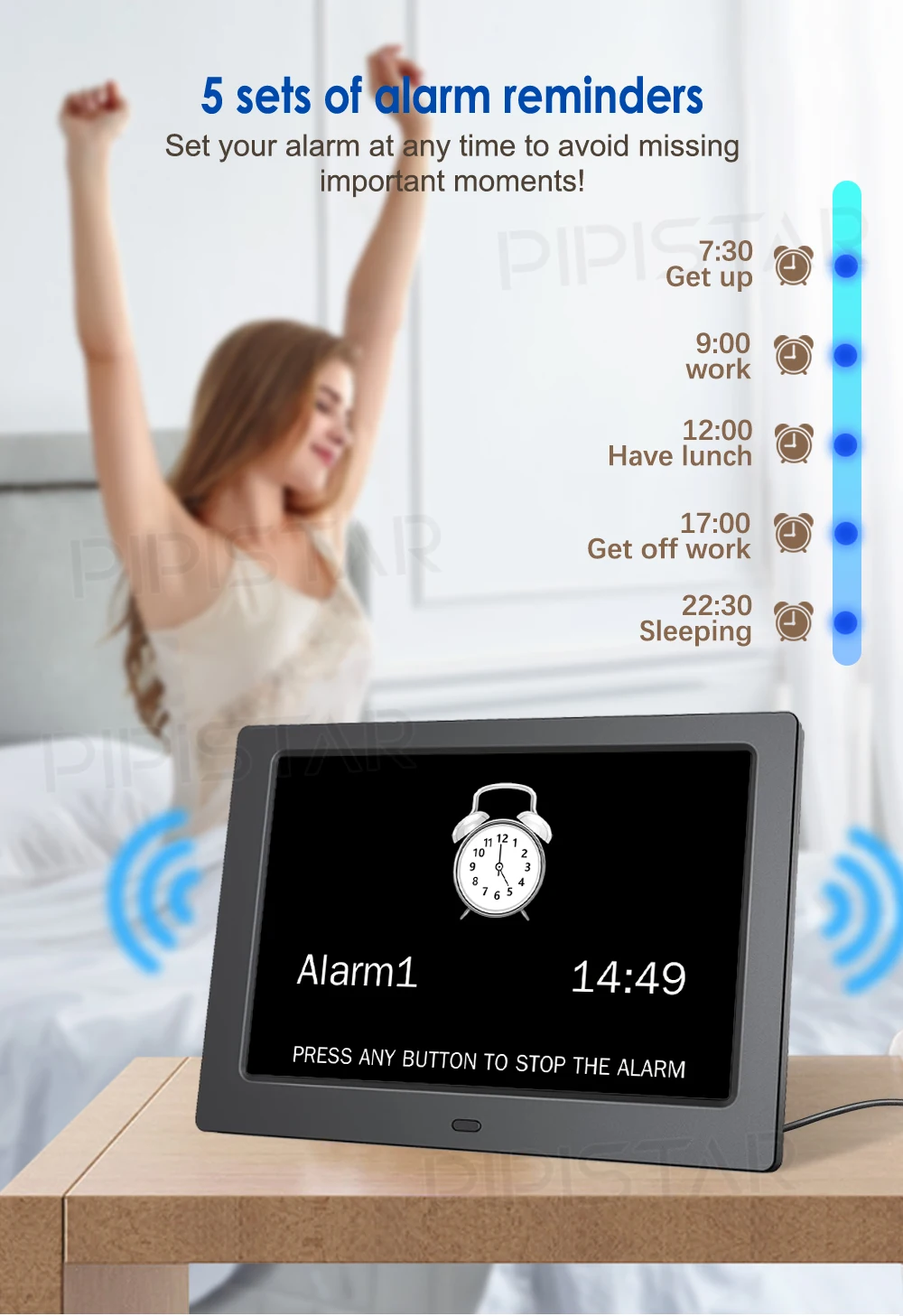5. Powered by a power source, no battery!!! High definition display function: 1024 * 600 high-definition LCD screen, time mode [12 or 24 hours or afternoon], date mode [MM/DD/YY&DD/MM/YY]