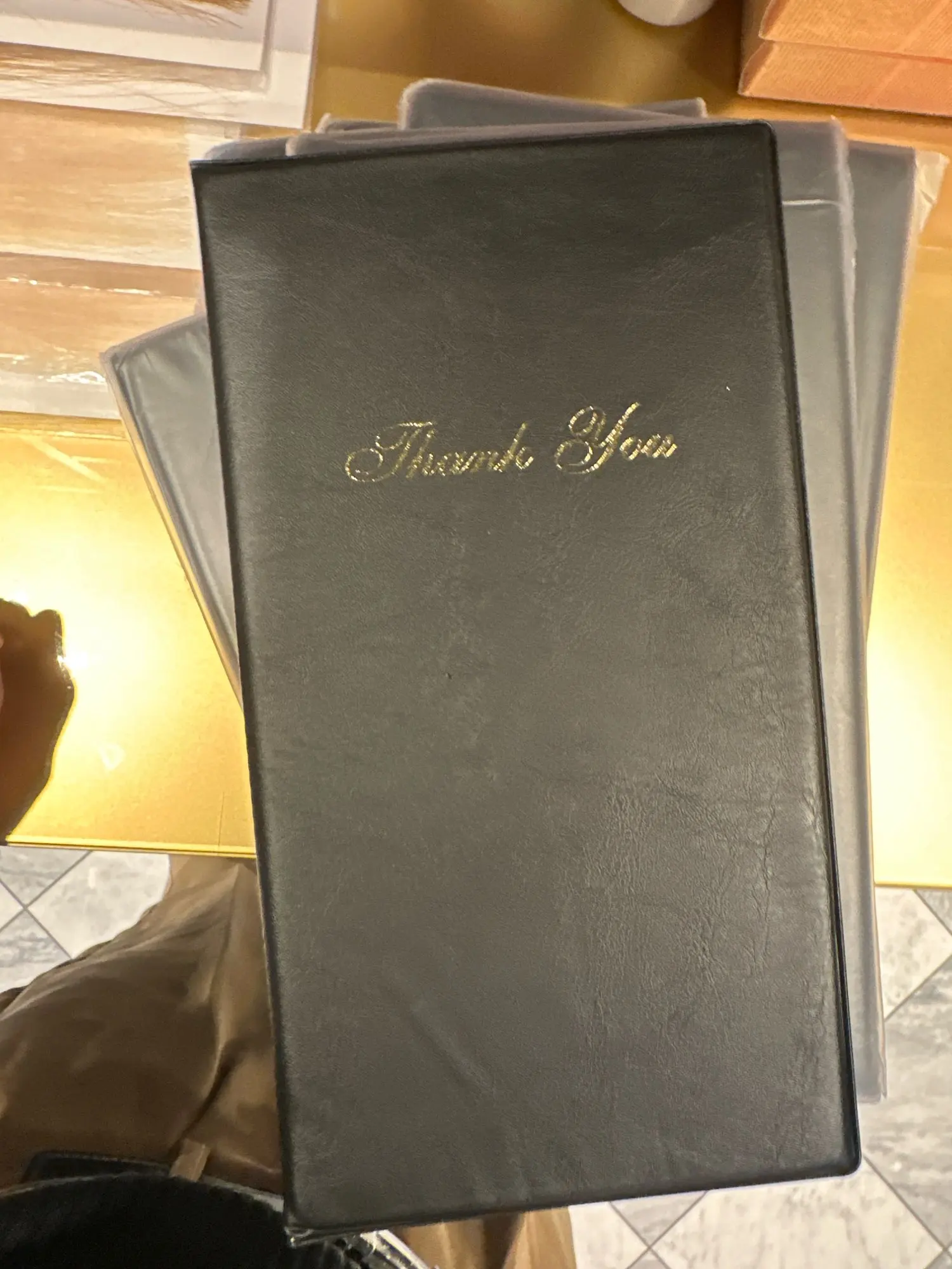 Black Vinyl Guest Check 11mm Thick, 2 Interior Pockets, and 1 Credit Card Holder for Safe Storage of Cash, Bills, or , Clear Card Pocket to Display Guest Cards, Gift Cards and Credit Cards Can Be Slid in and out easily and freely. Pre-printed with 'Thank You' in gold leaf on the front, a great way to communicate with your guests and end table service.