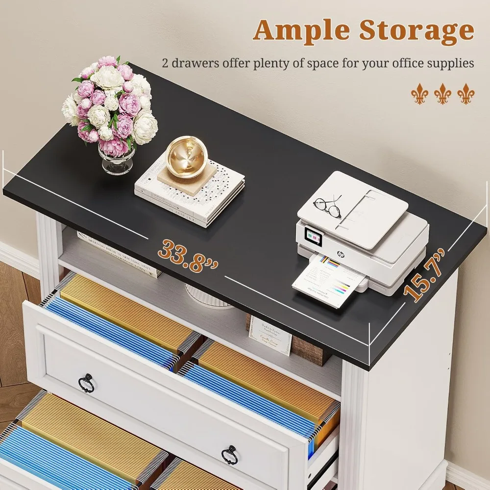 - 【Ample Storage Space】 33.8" L x 15.7"W x36" H file cabinet is perfect for your home office. The 3-tier file cabinet provides enough room to hold books, printer, photocopier, file for your home office. This office cabinet not only has two drawers for important documents, but also features open shelf for storage and display.