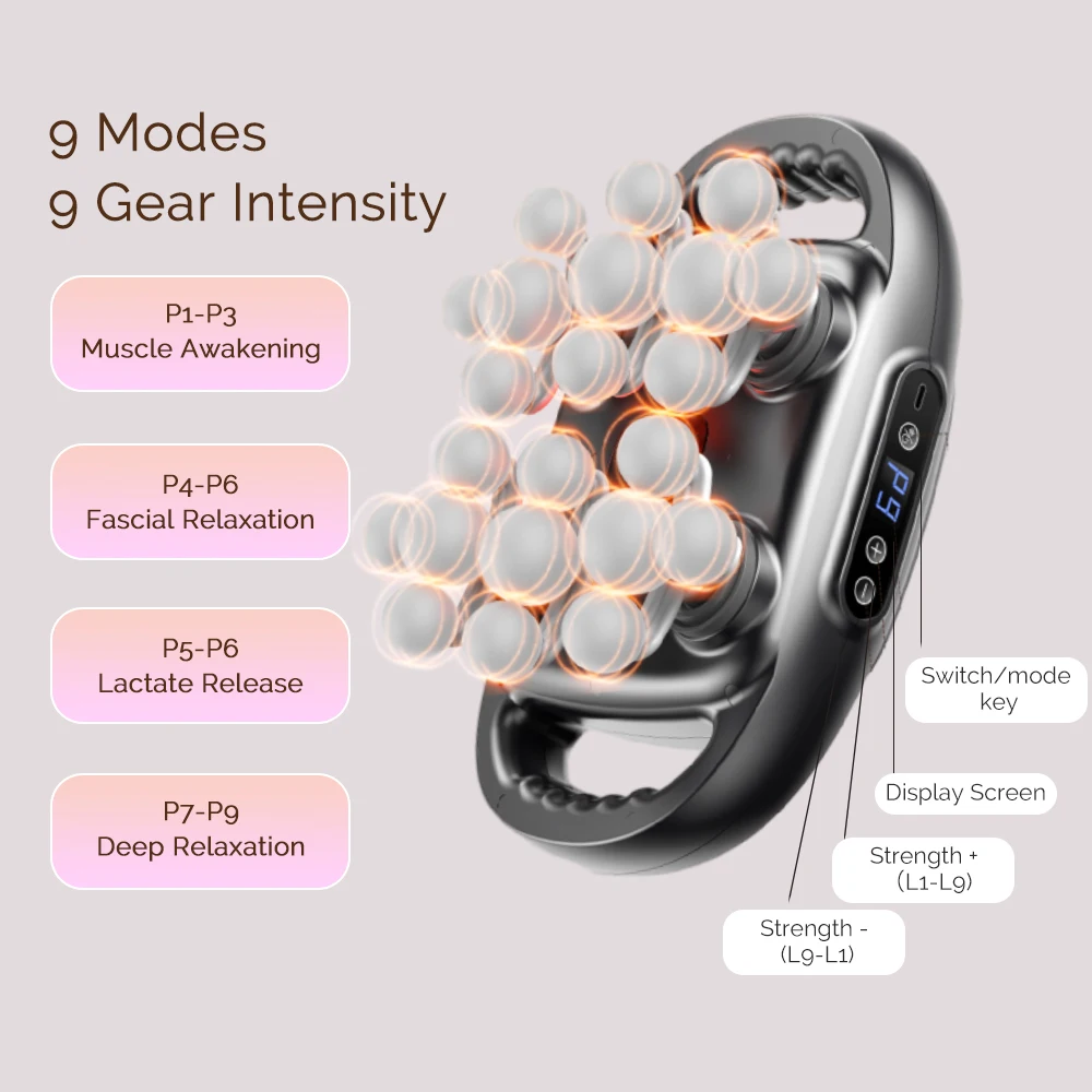 7.9 Modes, 9 Gear Intensity. Different modes correspond to different strike frequencies, alternating high and low frequency speeds, soothing tightness, reducing fatigue.