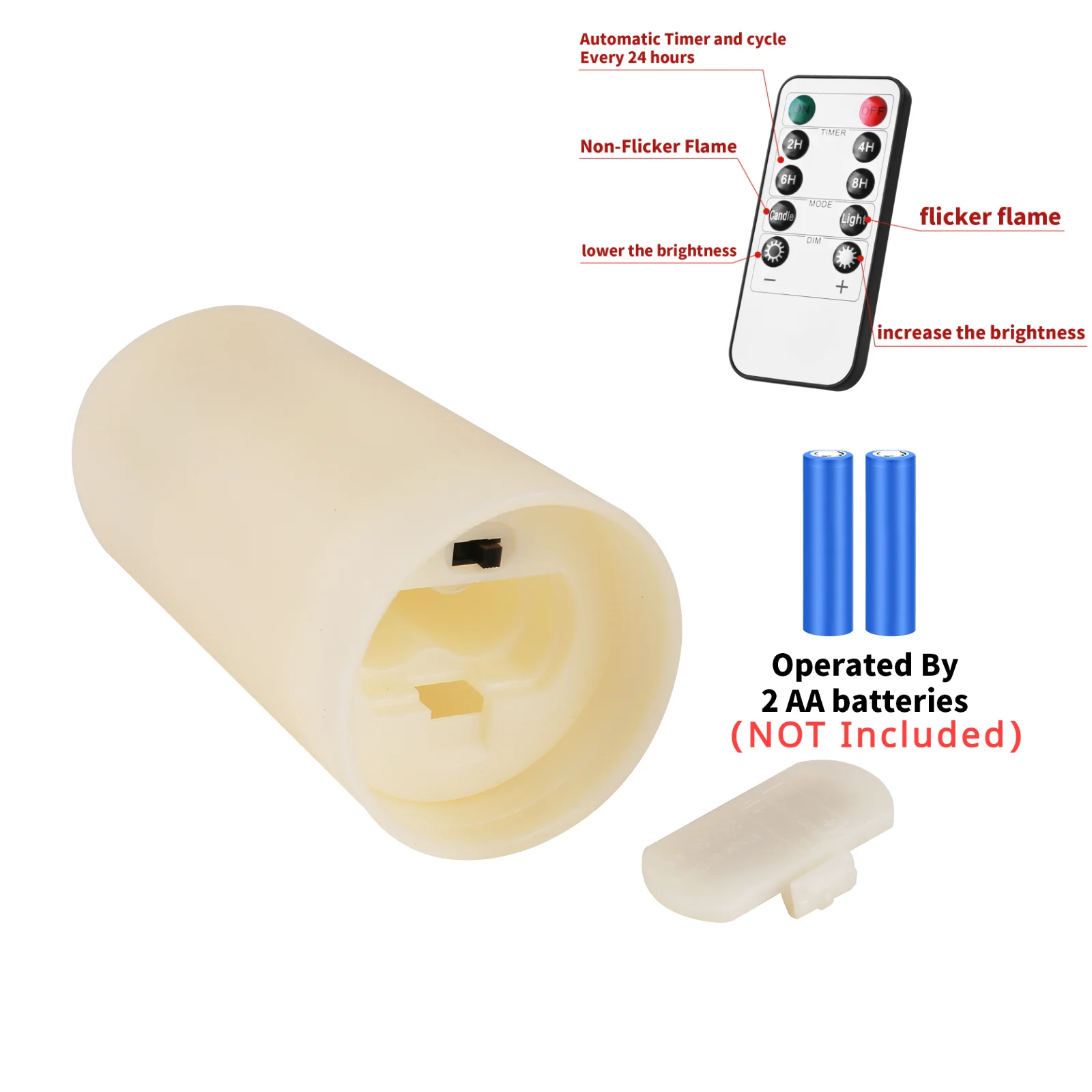 This value pack includes 3Pcs 4.1" pillars, 3Pcs 4.9"pillars, 3Pcs 5.8"pillars,3Pcs 6.8"pillars(each 2.2" diameter) candle, remote control x 2. Manual x1. This flameless candle is operated by 2 x AA batteries (Not included)
