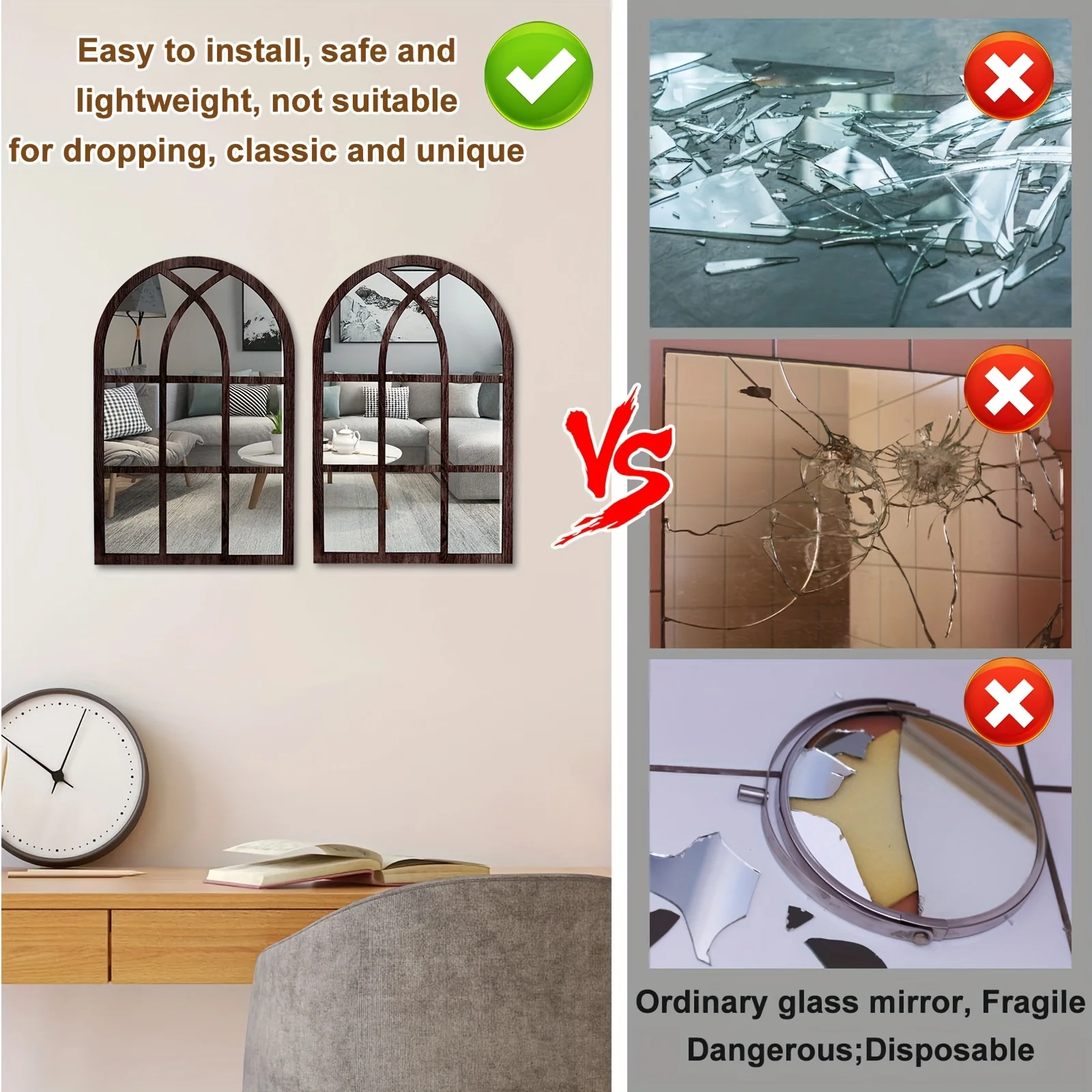 The product adopts an acrylic and wood double-layer design. The mirror surface is on top and the wooden board is at the bottom. The thickness of the wooden board is 0.5 centimeters. The thickness of the acrylic mirror surface is 0.2 centimeters. The first layer of acrylic mirror surface is adhered to the wooden board with a backing adhesive. There are golden hooks nailed behind the wooden board.The acrylic has a protective film. After receiving the product, you need to remove the protective film for use.