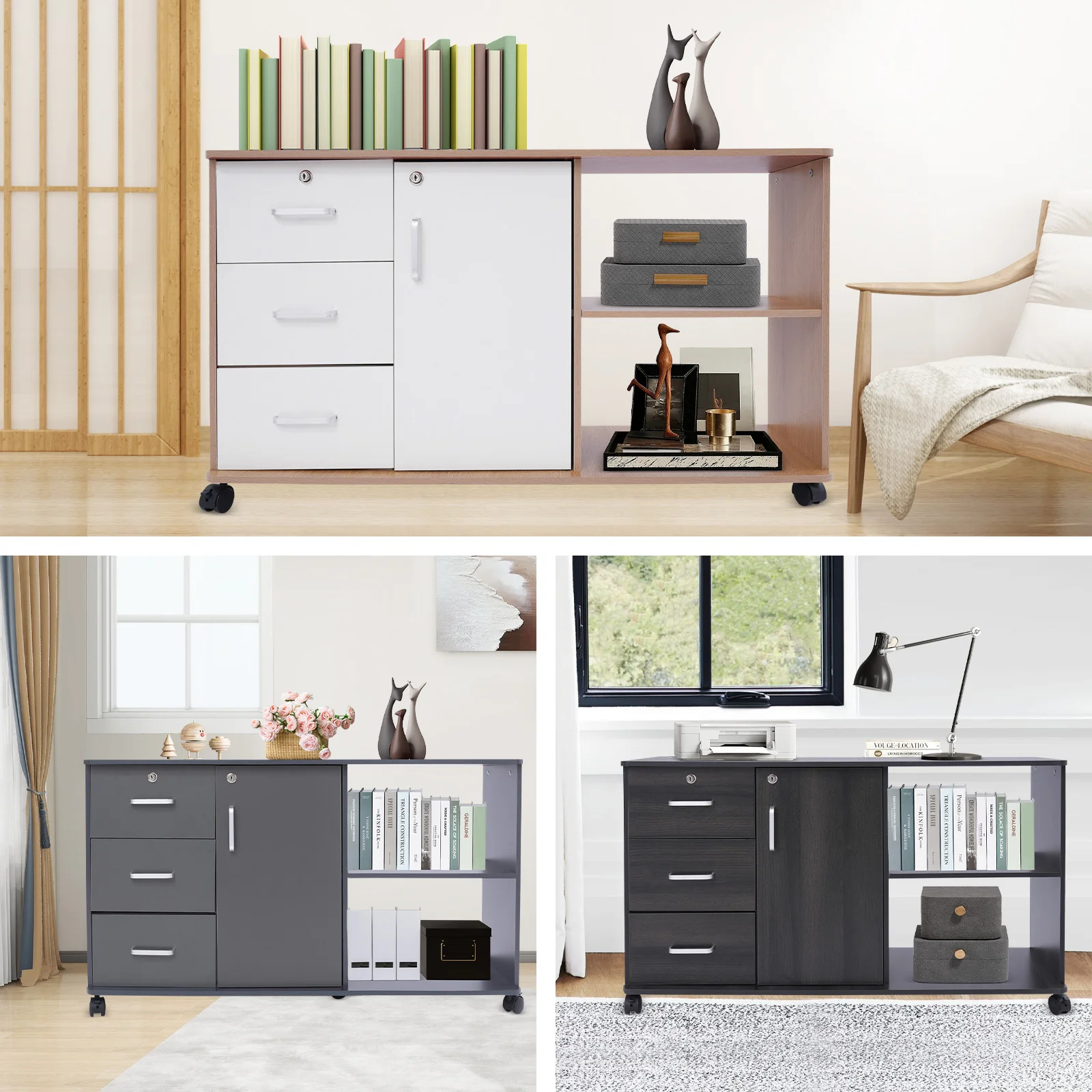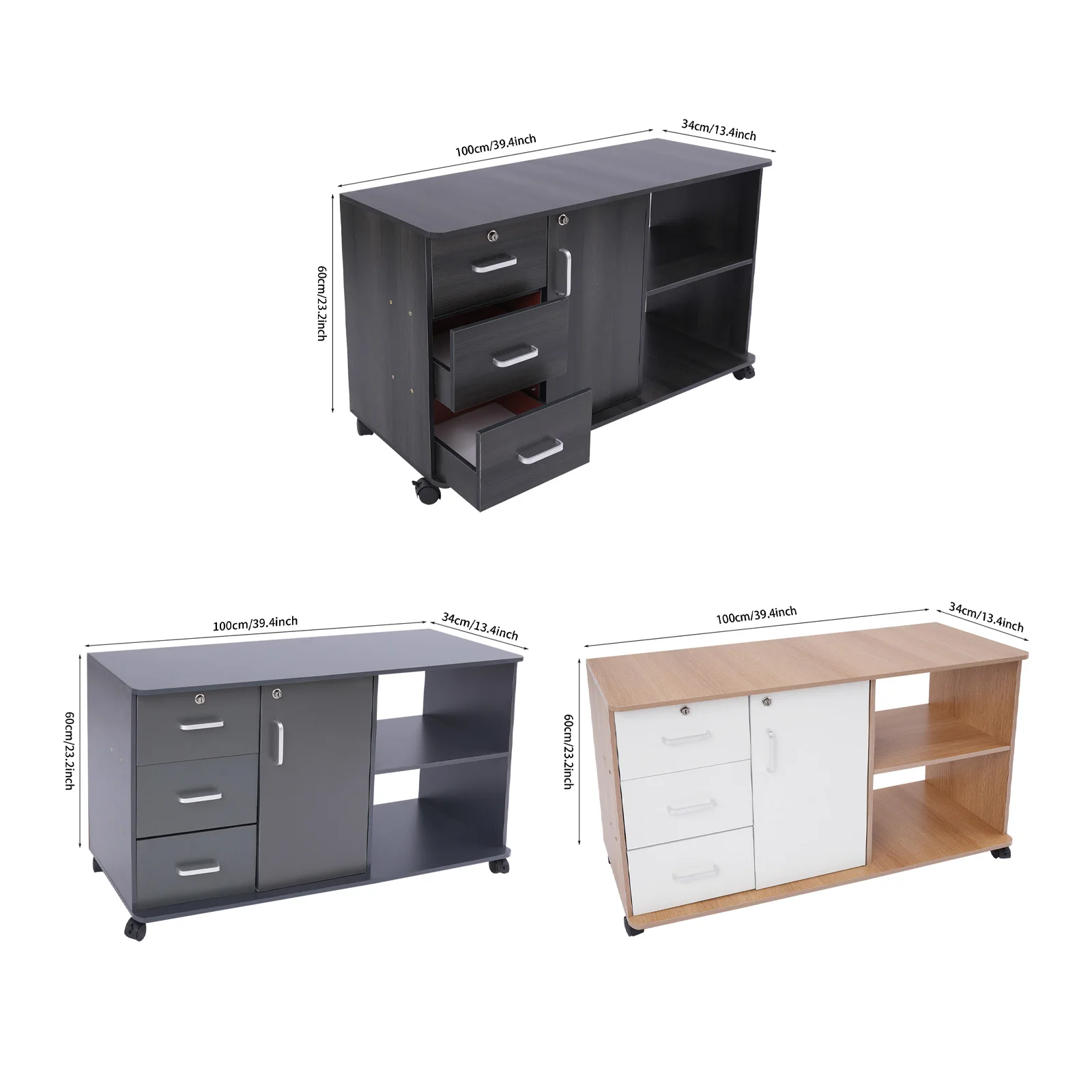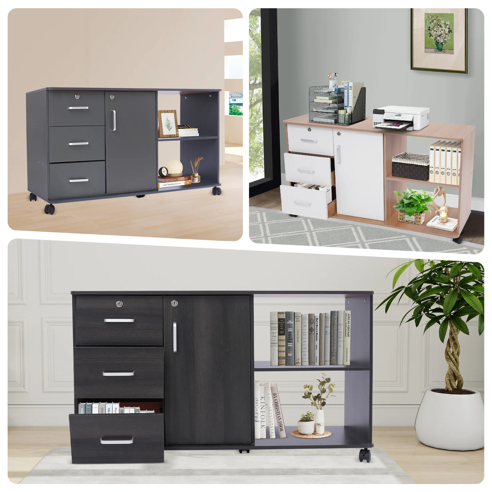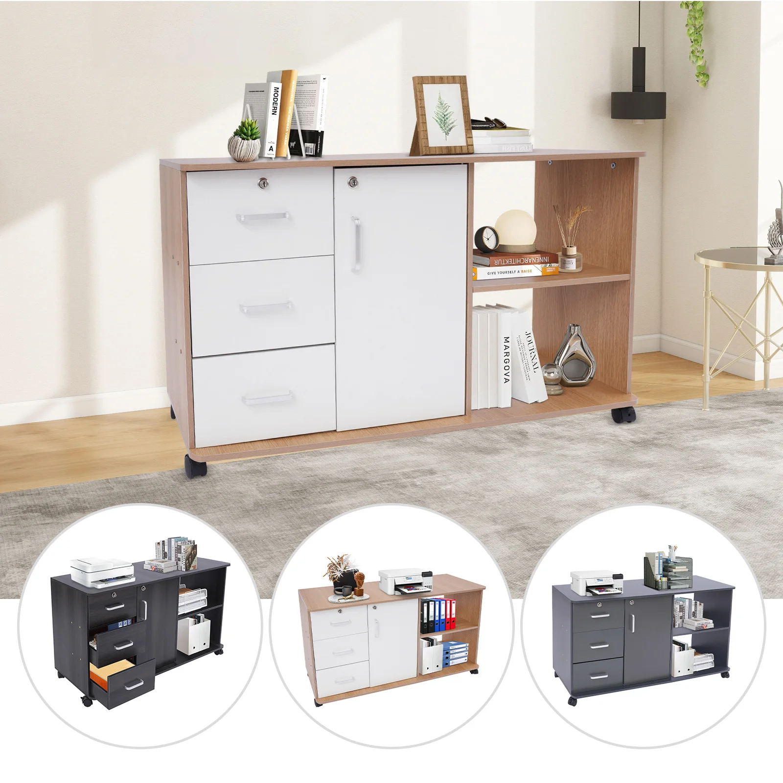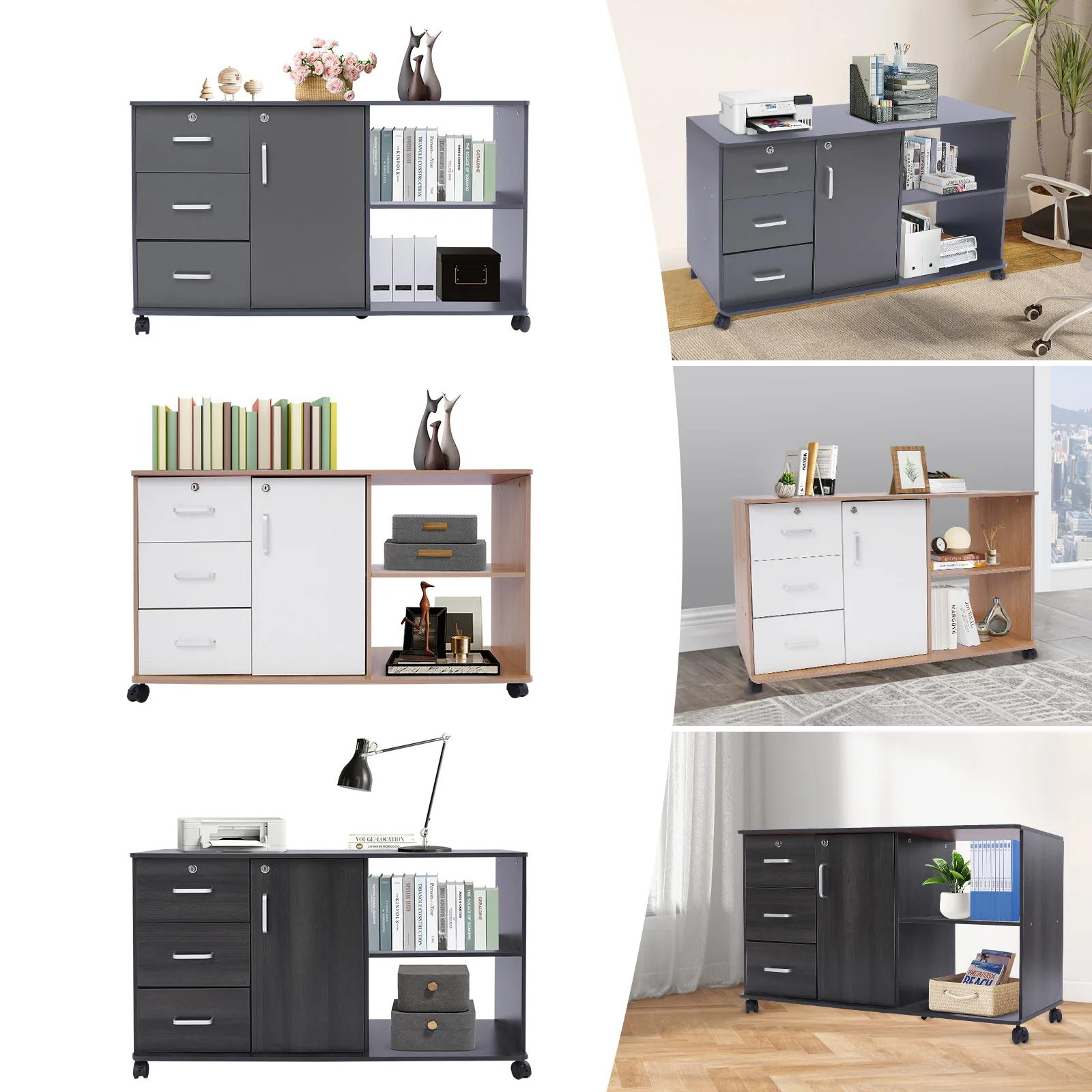 Large Storage Capacity: Designed with a combination structure of three drawers, one cabinet door, and two compartments, this product is able to fully accommodate various files and printers, fully meeting your office needs.