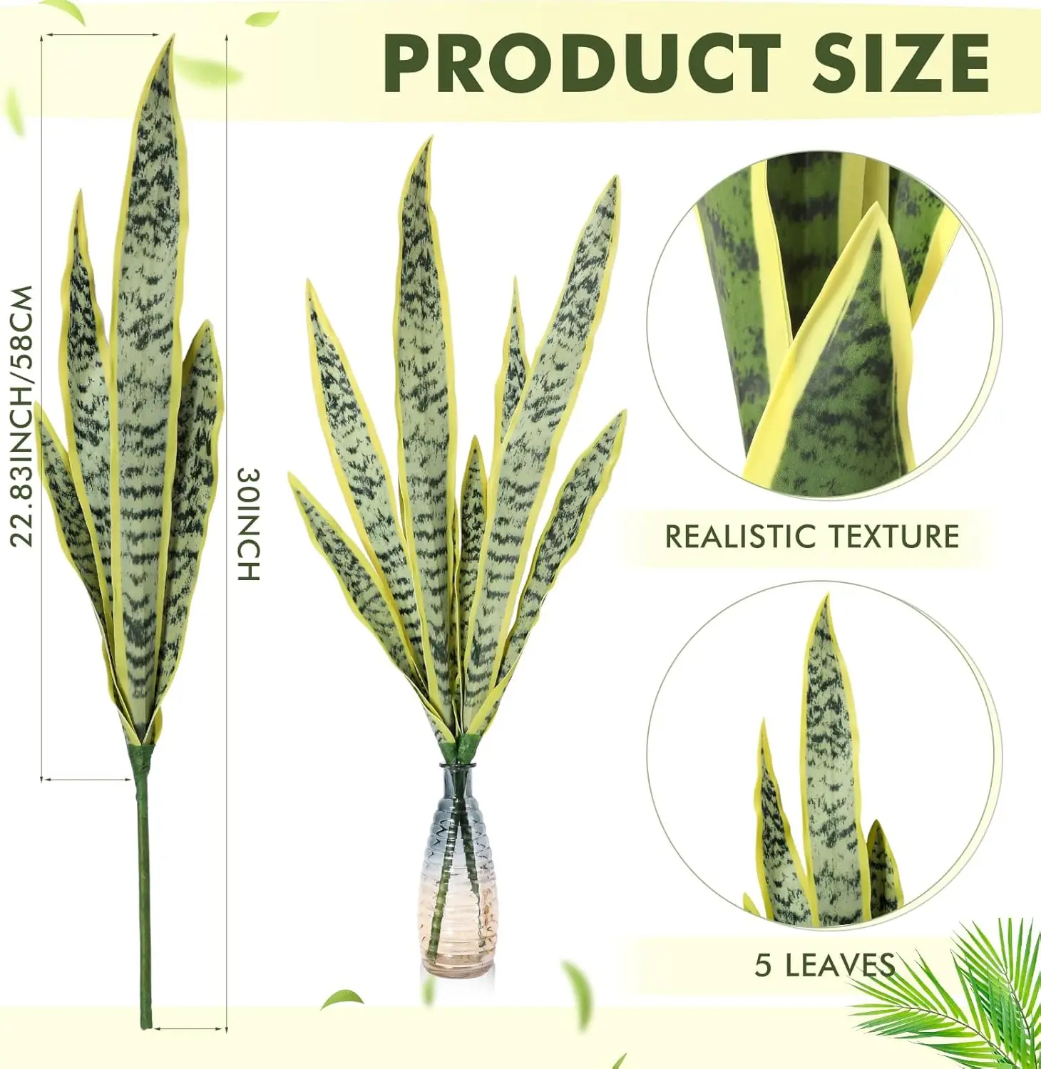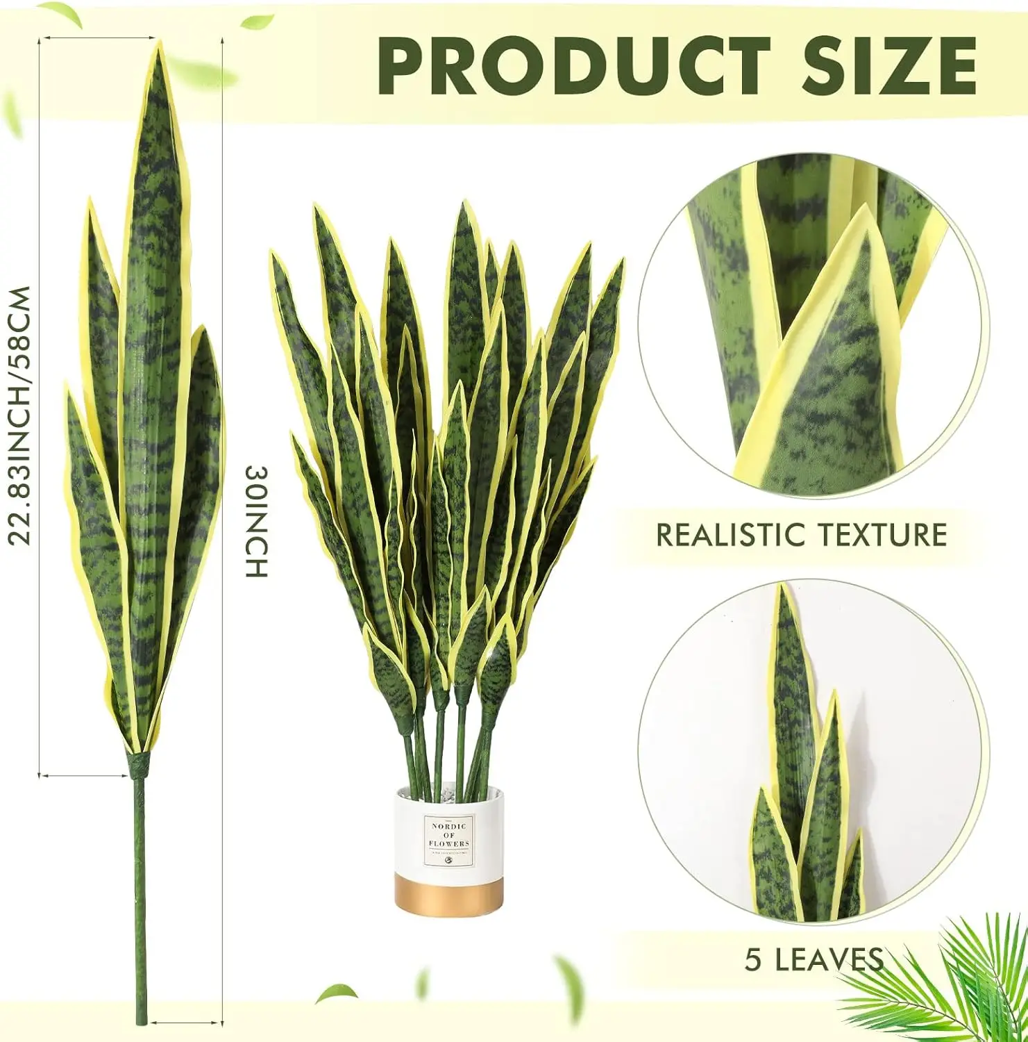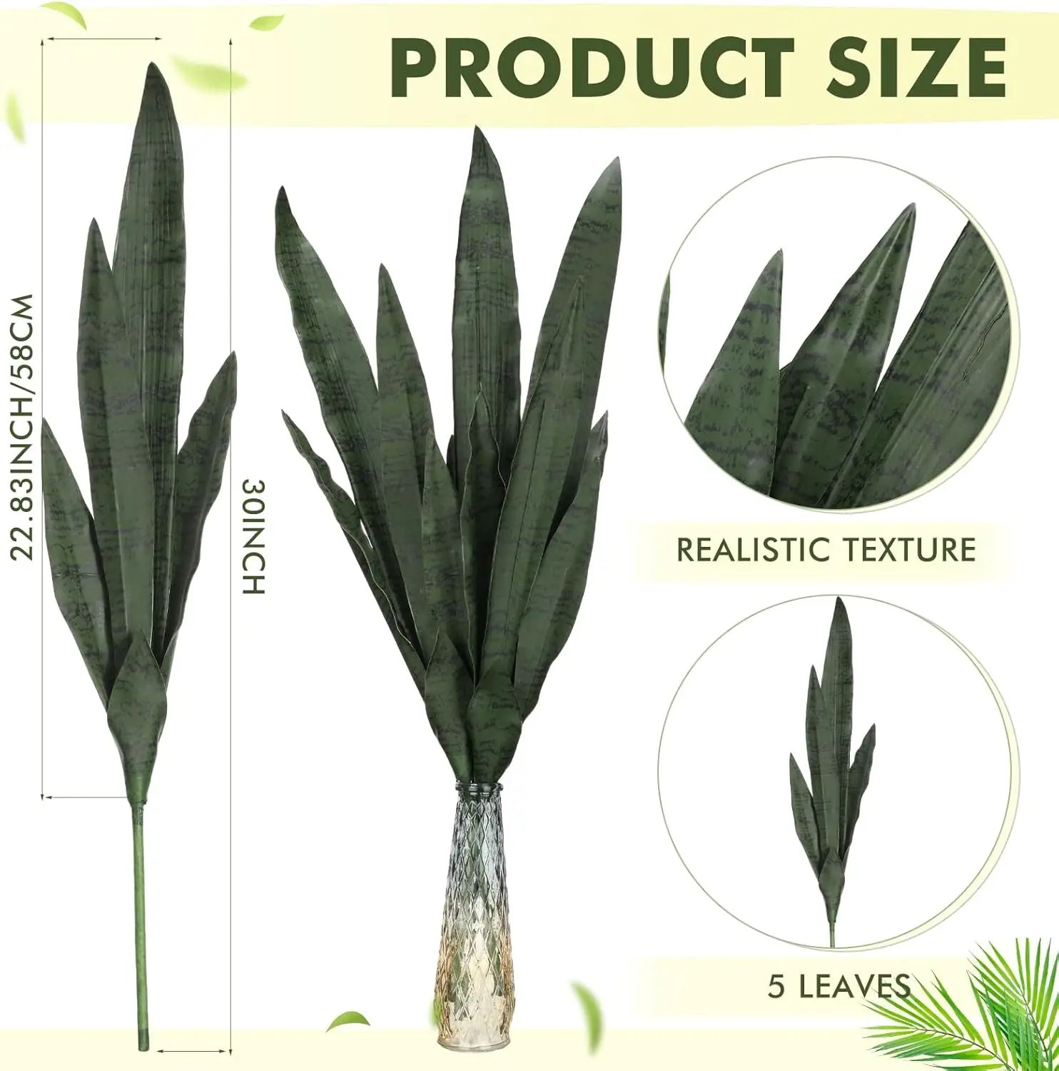 Sufficient Quantity: we will provide you with a total of 8 pieces of snake plants, with a sufficient quantity for easy daily decoration and storage, which can meet your various decorative demands Reliable Material: our fake snake plant leaves are mainly made of quality plastic, reliable and realistic, with high ornamental value, reliable enough for a long time preservation; The branches are made of paper and wire, firm and stable, and can be bent according to your actual needs Appropriate Size: each faux snake plant is about 30 inches long; The proper size makes them easy to use, either as individual decorations for a vase or in combination with other decorations Delicate Design: fake snake plants are nice for home decoration in bedrooms and living rooms in different season, which can also be applied in restaurants, weddings, birthday parties, and other festive decorations, adding comfort to the whole environment and making the overall effect better Maintain for a Long Time: you don't have to spend too much time taking care of the artificial snake plant, easy and convenient to clean and keep, to add a natural and green atmosphere to your room and your home, making the bedroom or living room look more comfortable and lively