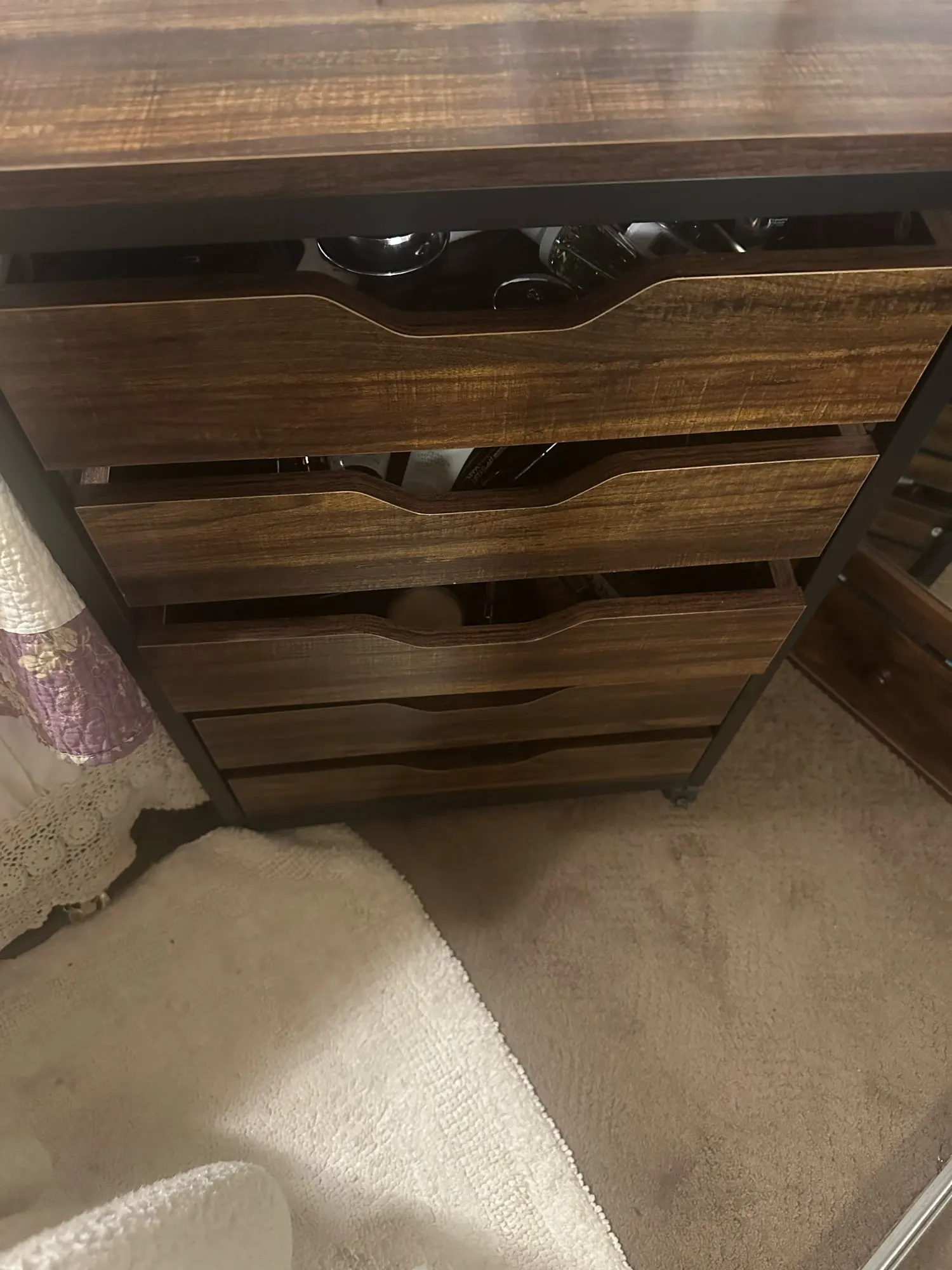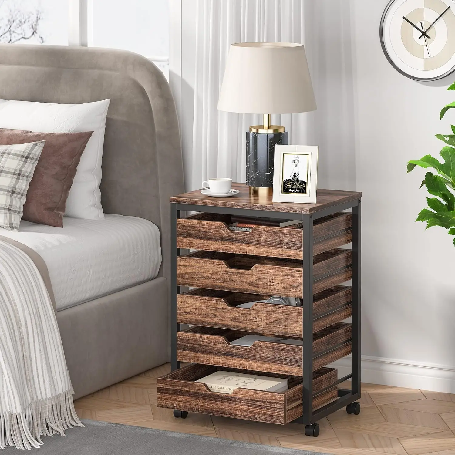 • 【Industrial & Versatile】With charming retro wood veneer with matte black metal frame,this 5-drawer cabinet chest create an industrial charm and can match almost any decoration style. It can be used not only as a mobile file cabinet but also as an office cabinet, makeup drawer unit, storage organizer chest for office, bedroom, living room, etc.