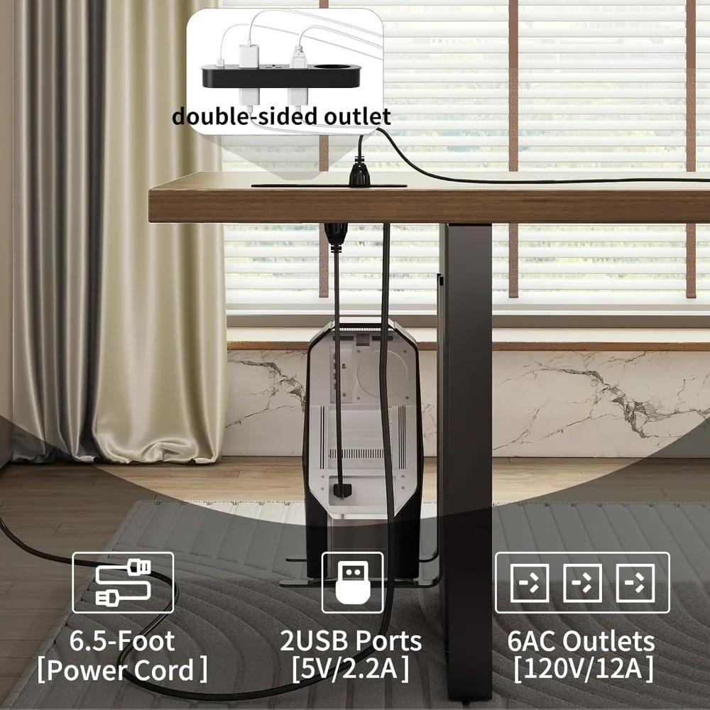 • With Desktop Outlets: This office desk is equipped with a built-in power strip providing power on both the top and bottom surfaces, featuring 6 AC outlets, 1 USB port, and 1 Type-C port. It conveniently supplies ample power for your electronic devices, such as laptops, phones, and more.