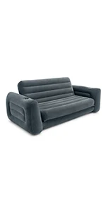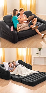 A versatile sofa that offers an affordable and comfortable sleeping solution for any home. Quick and easy to inflate. This sofa conveniently pulls out into a queen size bed and sleeps two people. Its portability makes it ideal to take on the road. The velvety soft surface provides added comfort, perfect for sitting or sleeping. 2 cup holders. Folds compactly for storage. Suitable for 5 years and up.