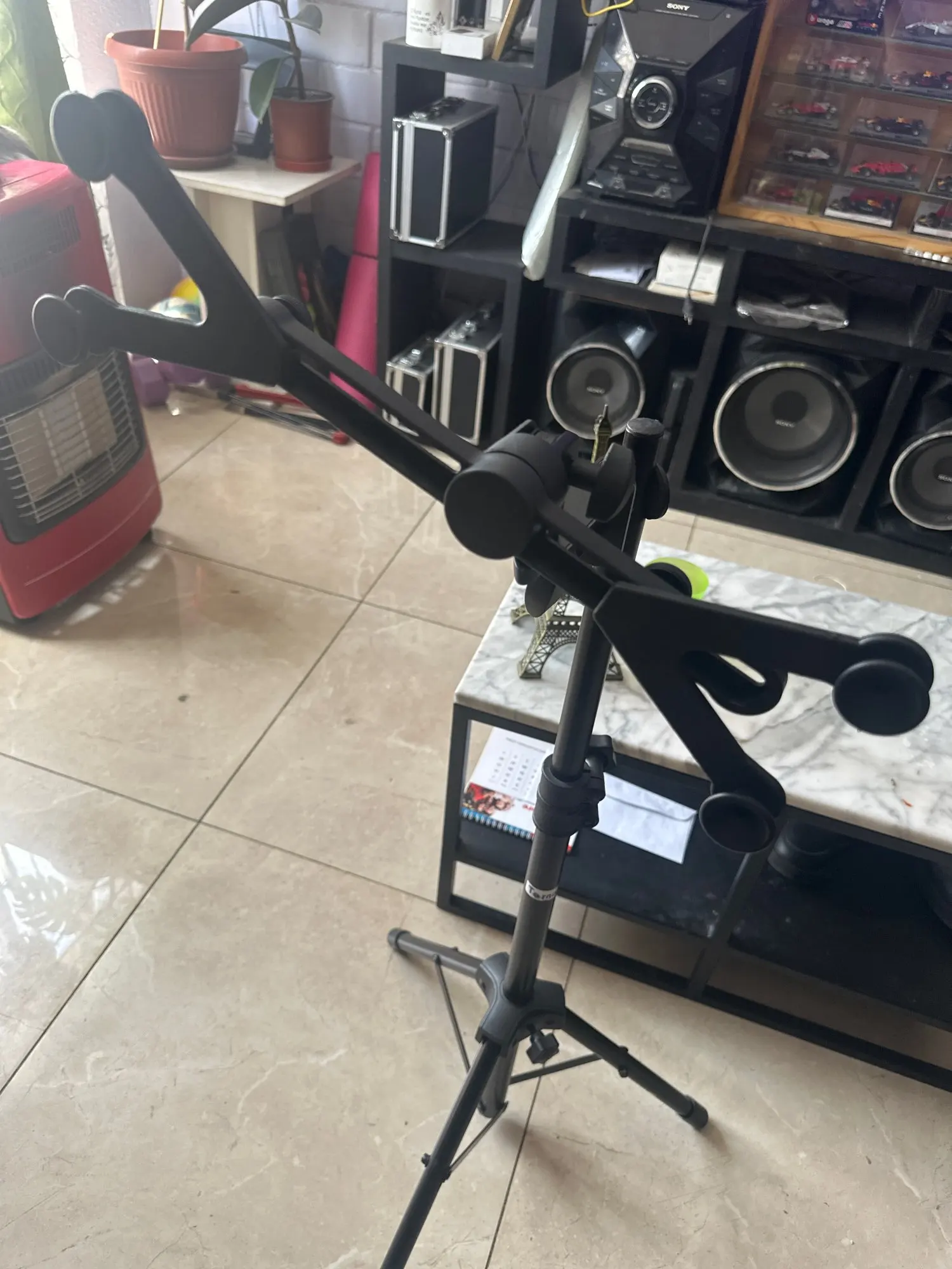Made of metal and plastic, stable to be clipped to microphone stand or music stand.