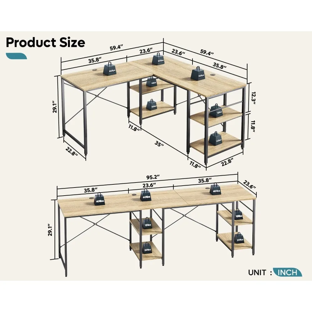 - 2 Different Configurations: Chosen it to be a 59.5" corner desk or a 95.5" double long desk, it's up to you. The l option makes full use of corner space and the long option is very suitable for 2 person working together.