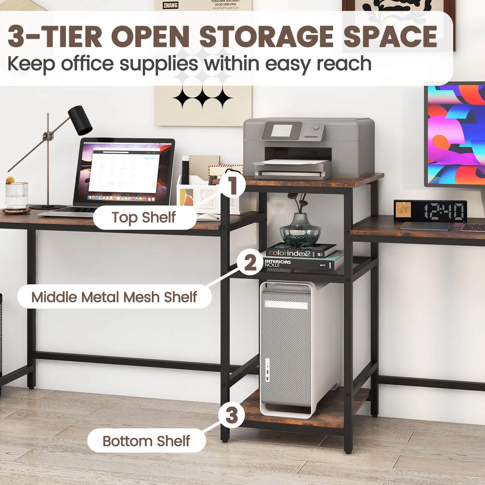 3-tier open shelf keeps printer, books, files and other items within easy reach
