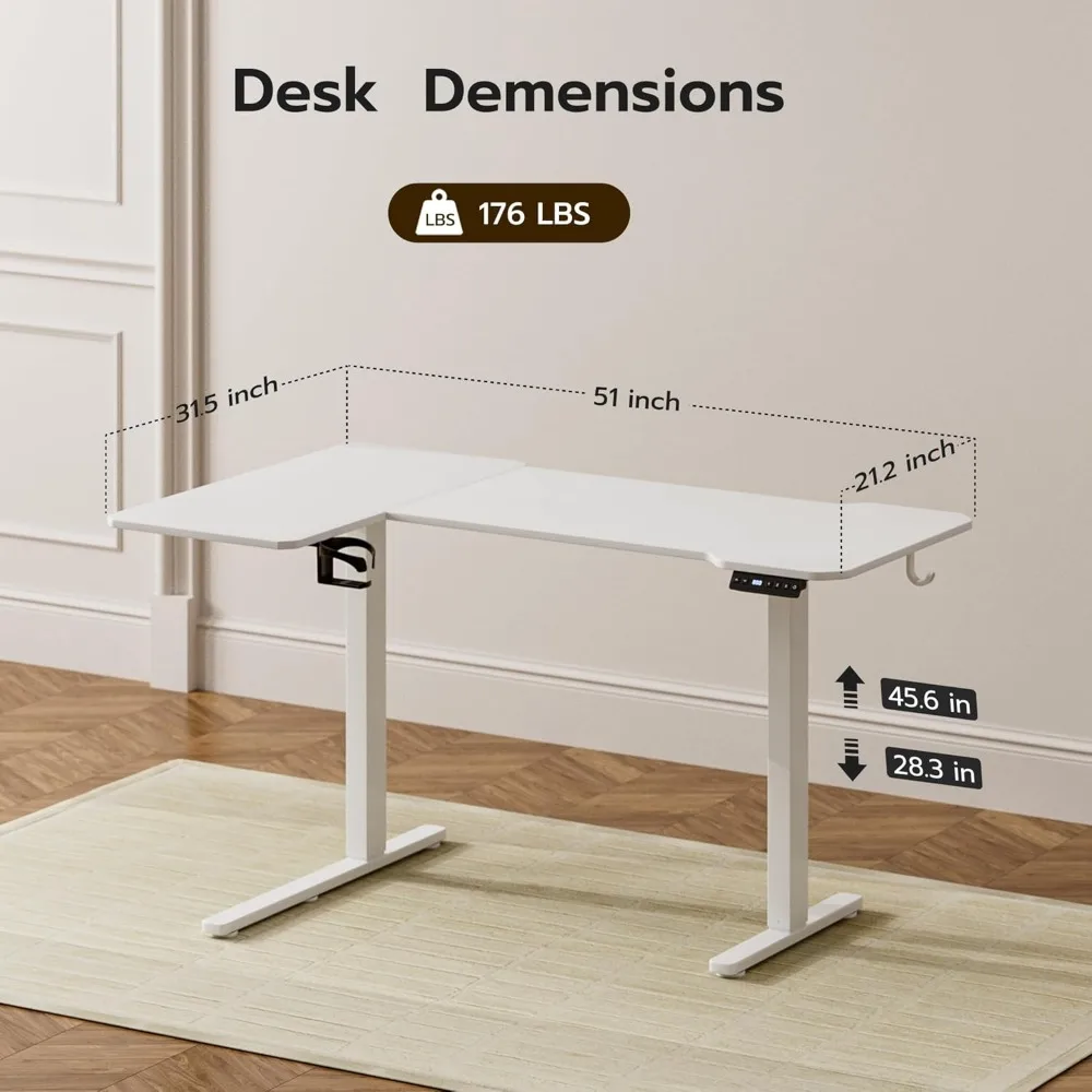 This sit-stand desk features a reversible L-shaped corner design with an adjustable 51" x 31" desktop, suitable for both left and right-handed users and capable of supporting multiple monitors for daily tasks. It's a game-changer for work-from-home setups, enhancing health and productivity with three preset memory height settings and a high-quality build that can support up to 176lbs. The electric height-adjustable desk allows for easy adjustments between 28.3" and 46.4" with a quiet motor that operates under 45db. Assembly is straightforward, taking approximately 30-59 minutes, with the tabletop made up of three sections that join together using screws and provided accessories, accompanied by a detailed manual and a precise installation video guide. We offer a 2-year manufacturer warranty, 7x24 customer support, and friendly tech support to address any questions or concerns you may have.