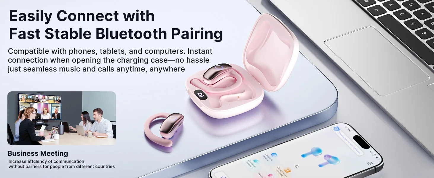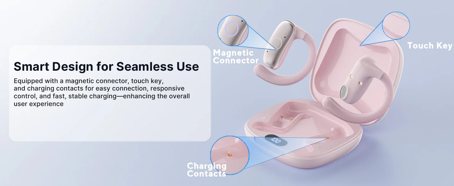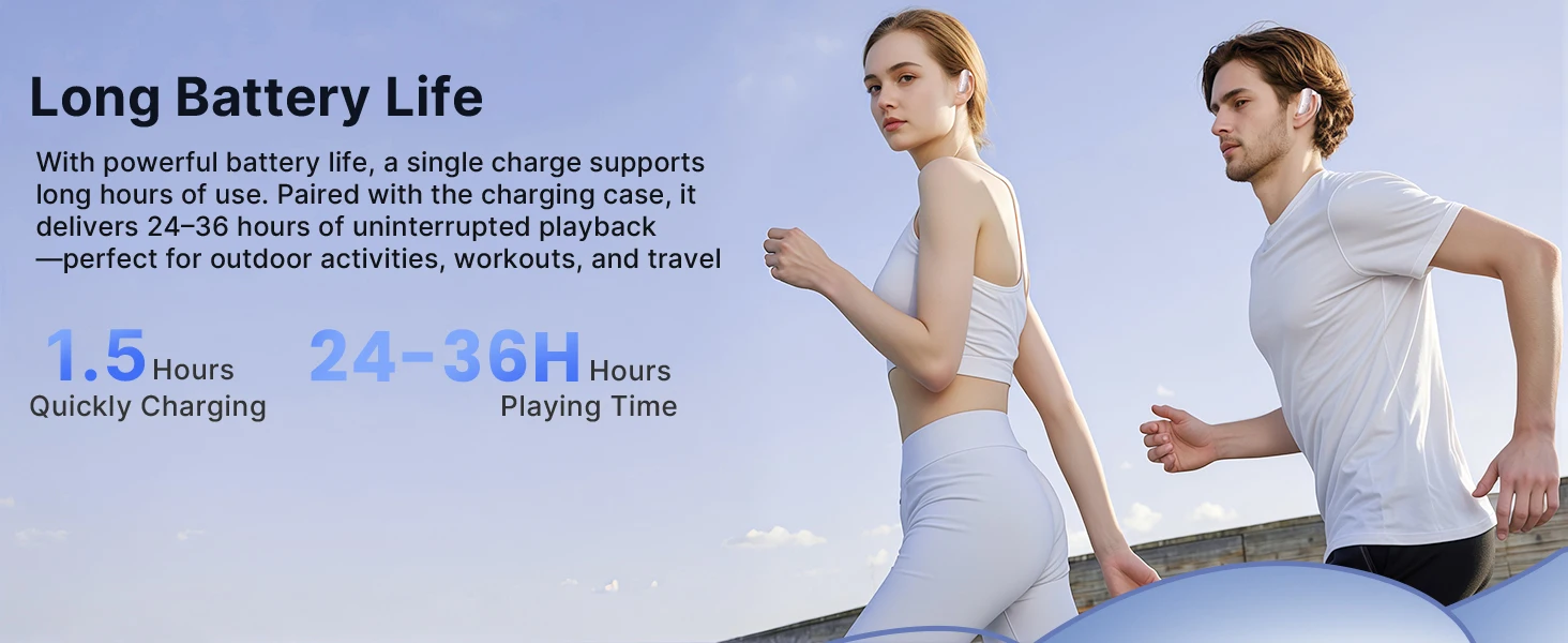 5. Extended Playtime and Digital Display: Enjoy up to 3-5 hours of use on a single charge, with the running headphones' charging case providing an additional 24 hours, totaling 30 hours of playtime. The smart LED display shows remaining battery life, eliminating power concerns.
