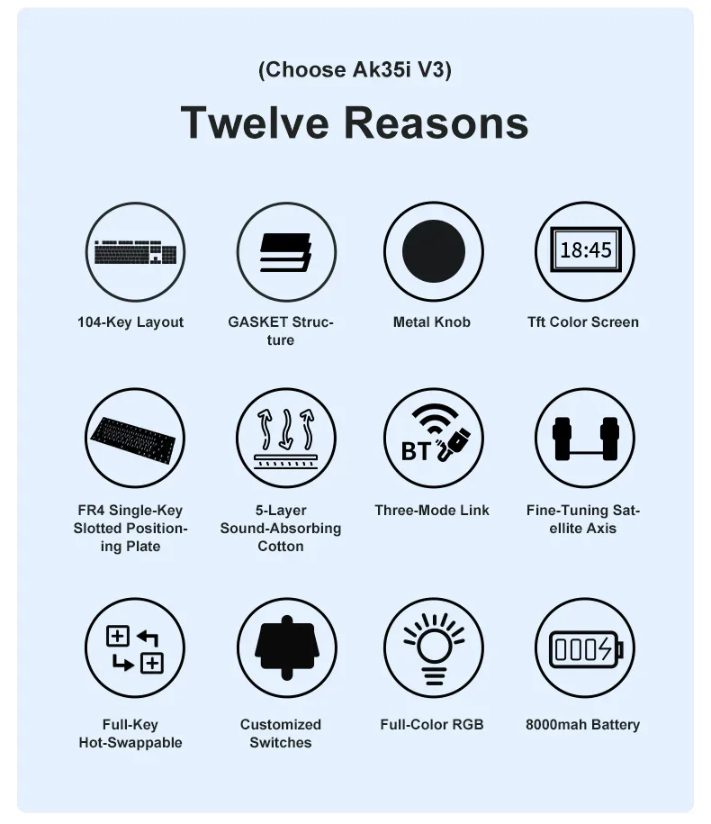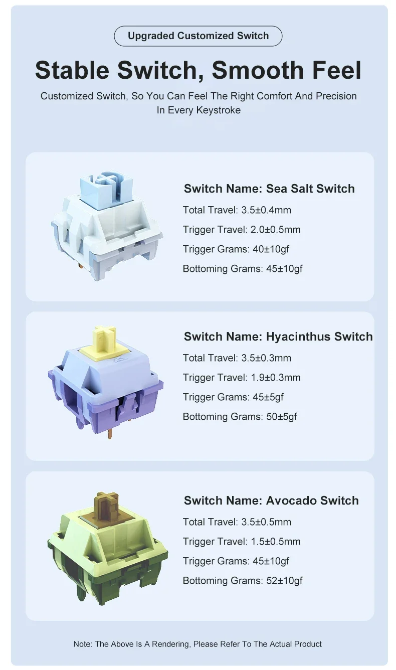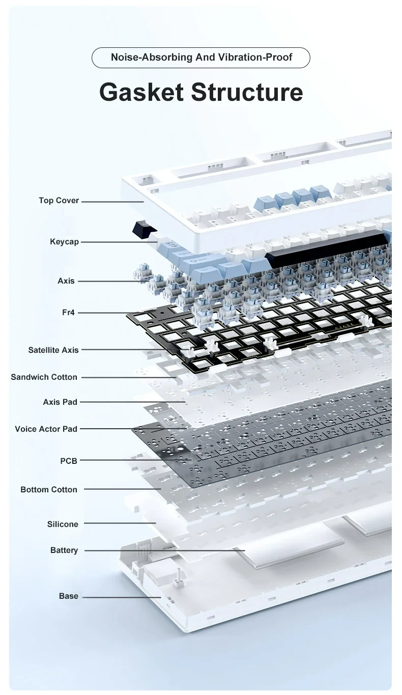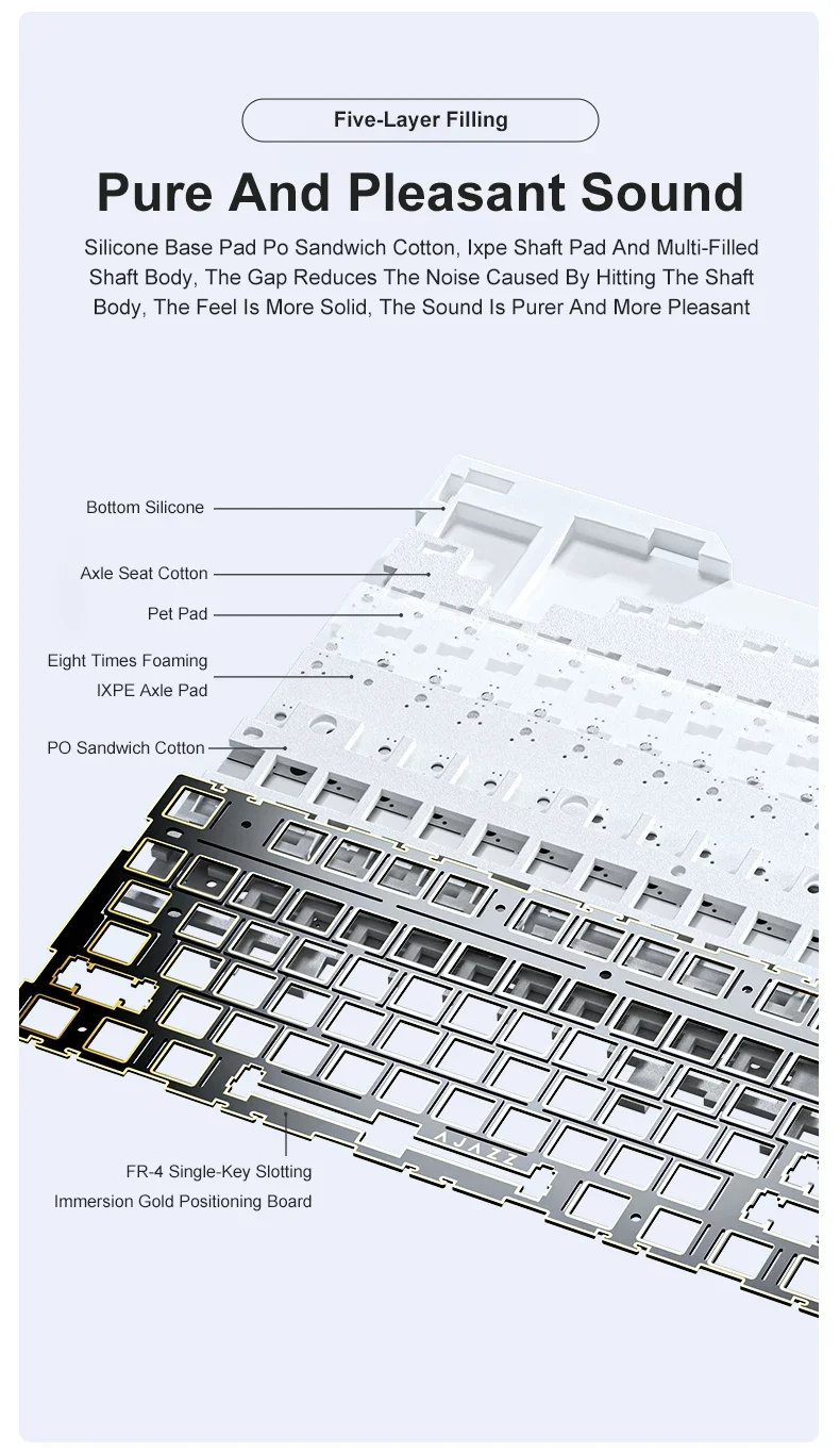 • Pure and pleasant sound:Silicone base pad PO sandwich cotton,, lXPE switch pad andmultiple filling switch body.The gap reduces thenoise caused byhittingthe switch body, and the feel is more solidThe sound is purer and more pleasant.