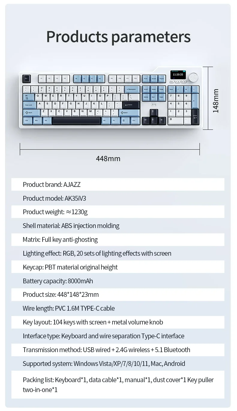 Packing list: Keyboard*1, data cable*l, manual*l, dust cover*1 Key pullertwo-in-one*1