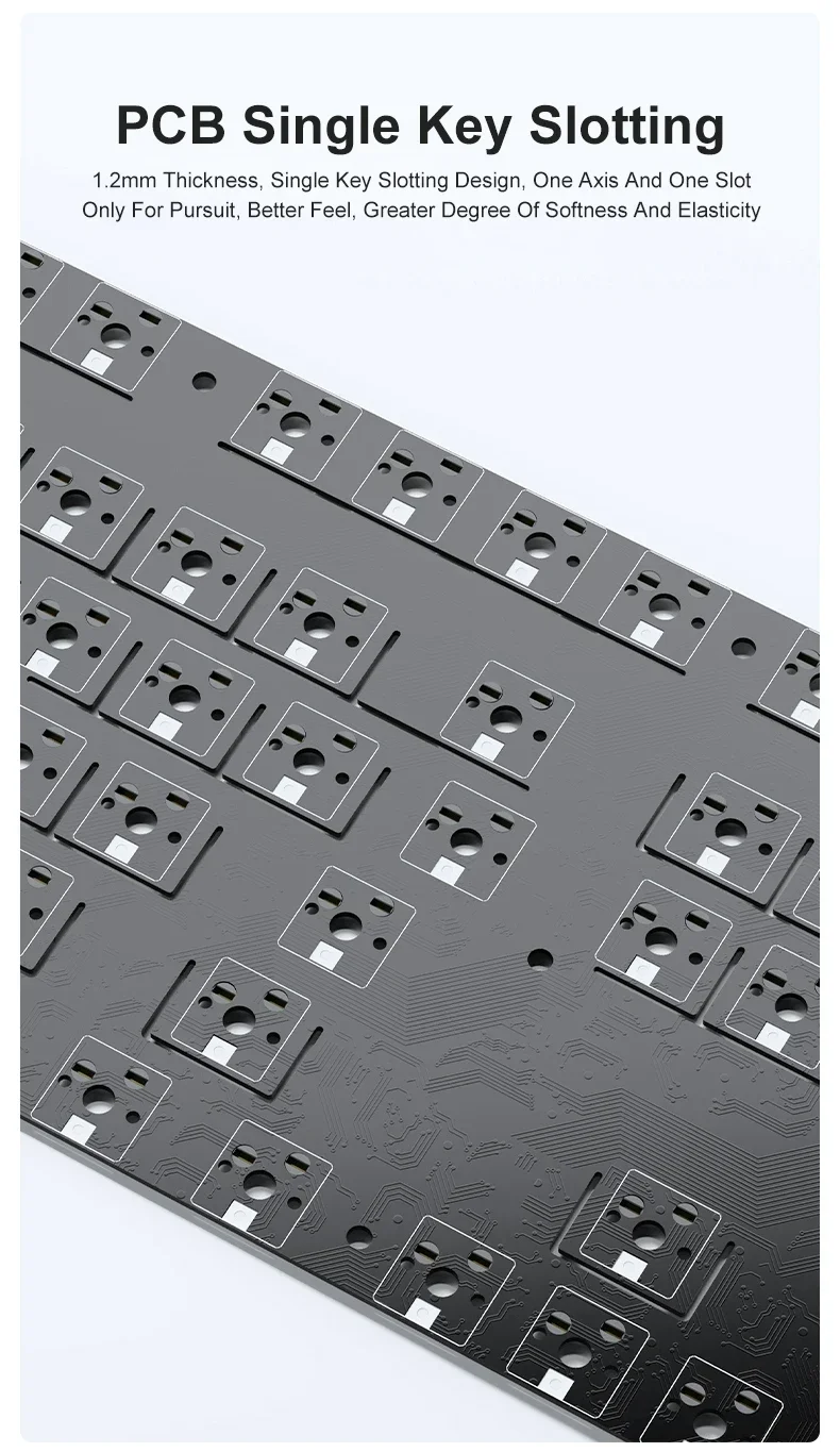 • PCB single key slot:1.2mm thickness, single key slot design, one switch and one slot just for the pursuit ofbetter feel, greater softness and elasticity.