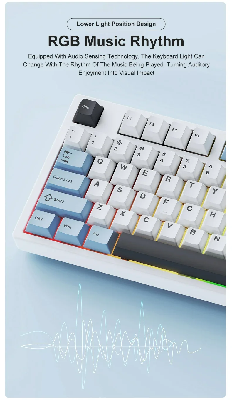 • Lower light position design:RGB music rhythm,equipped with audio sensing technology, thekeyboard light can change with the rhythm ofthe music being played,turning auditory enjoyment into visual impact