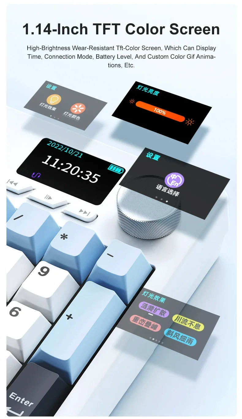 • 1.14-inch TFT Color Screen:High-brightness wear-resistant TFT color screen, which can display time, connection mode, battery level, and custom color gif anima-tions, Etc.