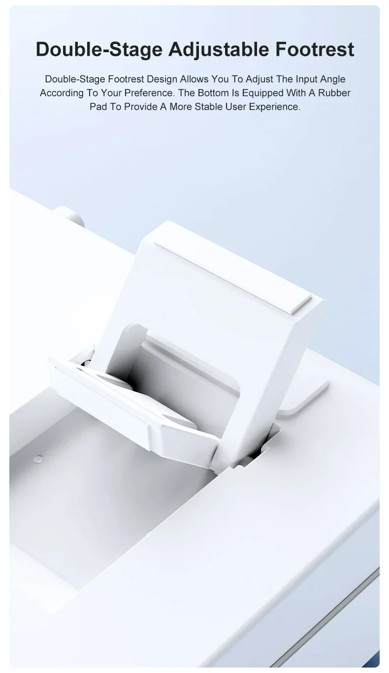 • Double-stageadjustable footrest:Double-stage footrest design allows you toadjust the input angle according to your preference, Rubber padsat the bottom provide a more stable experience.