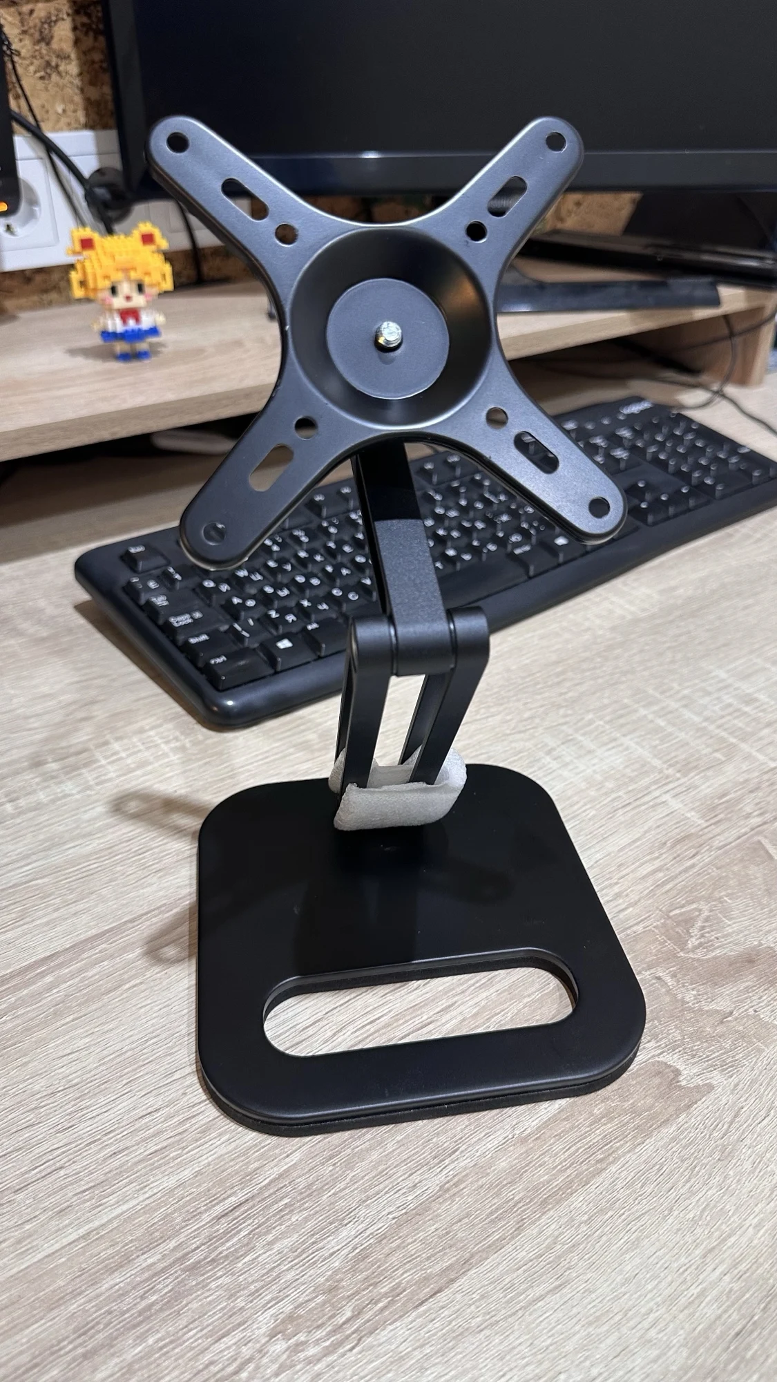 The item is exactly what i was looking for and even comes with separate attachments for different mounting solutions. The quality is decent and i have not experienced any drooping or looseness after fastening an 18" monitor in position.