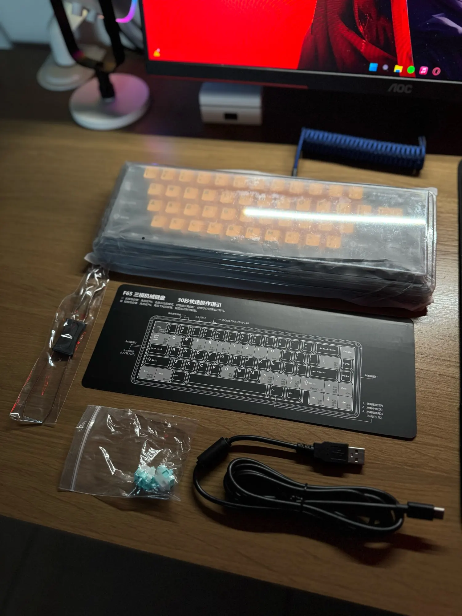 AULA F65 equipped with built-in 4000mhA capacity lithium battery, which can be charging through the Type-C cable while using in wired mode. When fully charged, it lasts about 350 hours with the light off.