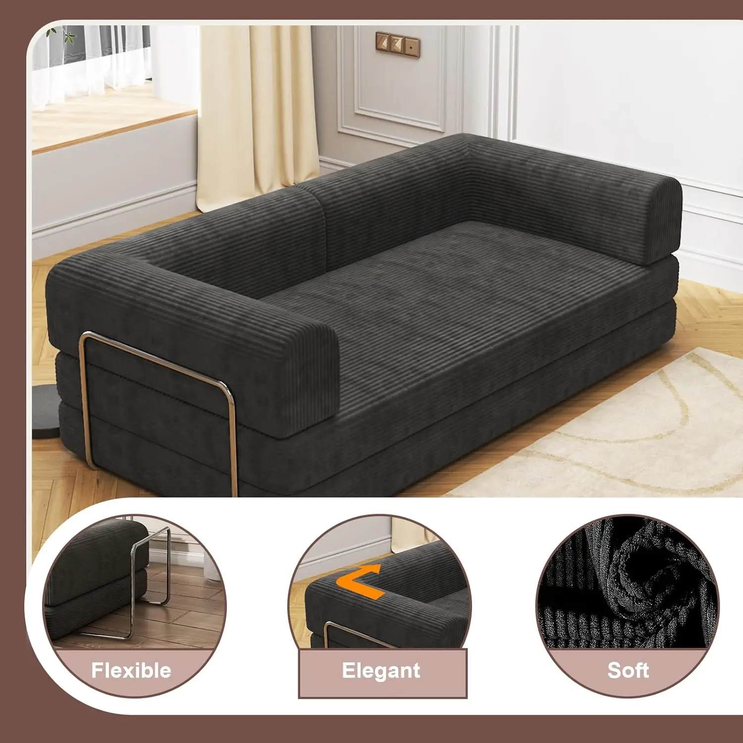 Convertible Corduroy Sleeper Sofa Bed,Folding Mattress Couch with Fixed-Shape Frame, 3 Seater Fold Out King Size Futon,No Assembly Floor Couch for Living Room Dorm Studio 78.7*39.4*29.6 in Black