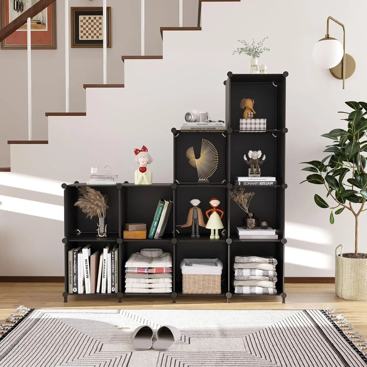 Cube Storage Organizer Storage 12 Cube Bookshelf DIY Plastic Closet Storage Shelves with Wooden Mallet, Ideal Storage Solution for Home, Bedroom, Black