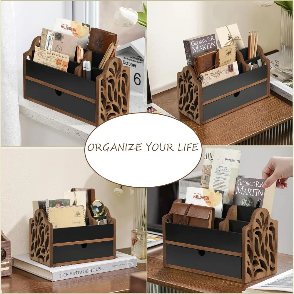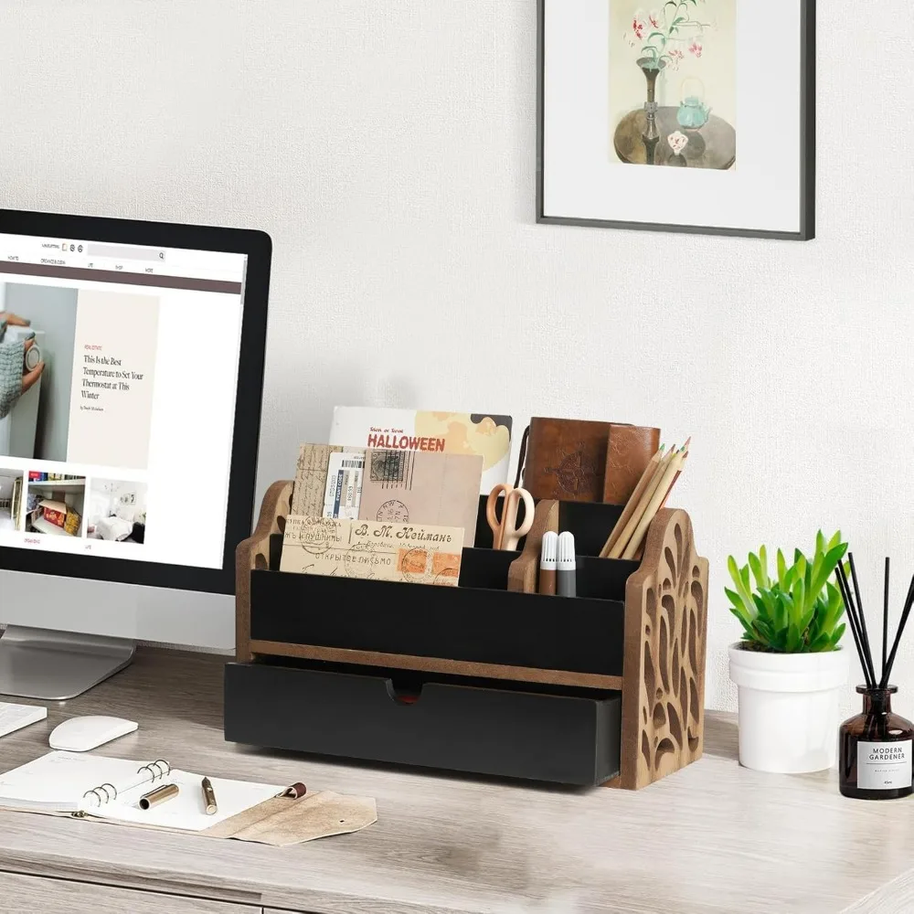 - 𝐏𝐚𝐭𝐞𝐧𝐭 𝐏𝐞𝐧𝐝𝐢𝐧𝐠 - Premium Desktop Organizer:Designed with 5 spacious compartments and a handy drawer, securely store pens, 8.5"x11" files, notebooks, and small gadgets in dedicated compartments. Vertical design saves 40% desk space than traditional trays