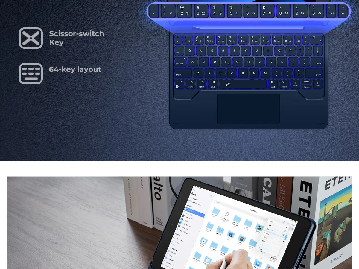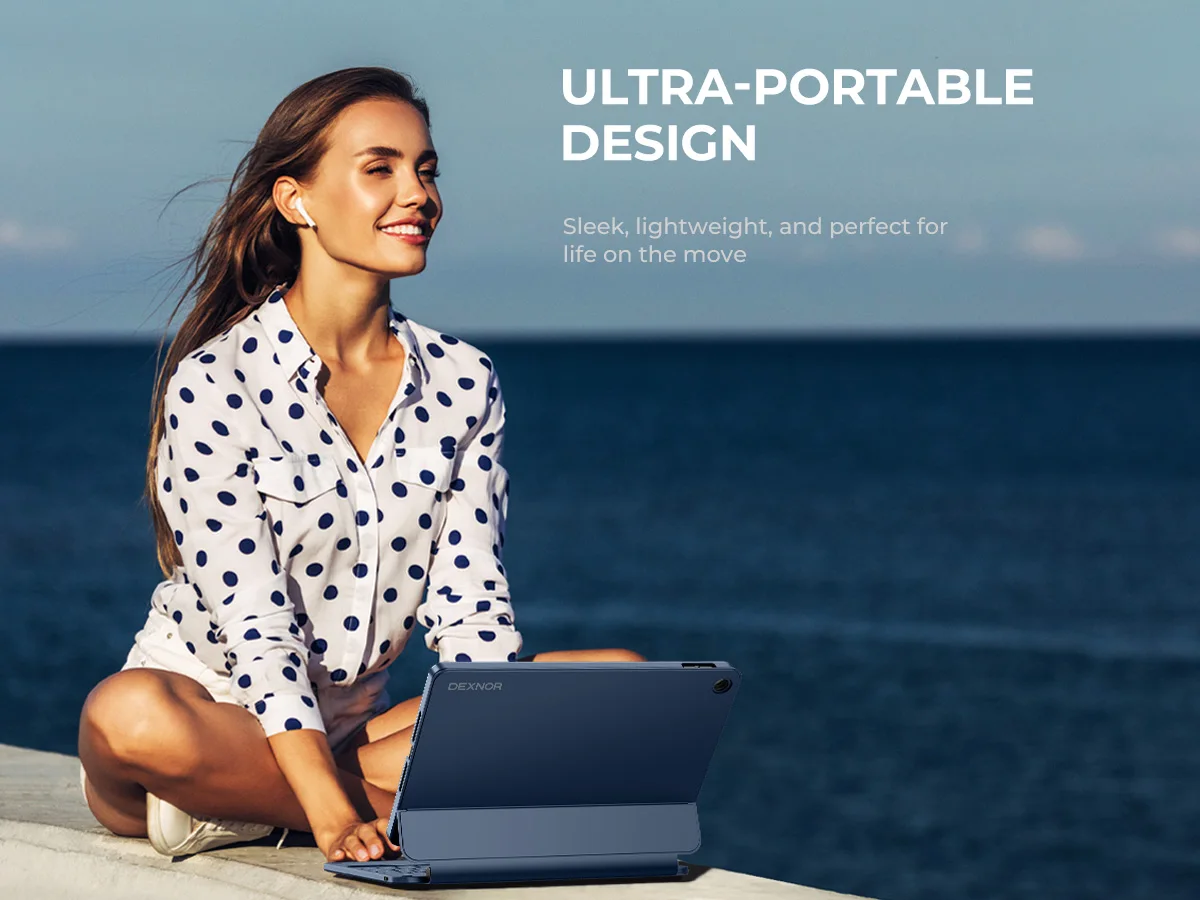 【EASY-SET MAGNETIC STAND】 A Sturdy aluminum alloy hinge with embedded magnets transforms your tablet into a laptop instantly, offering seamless adjustments for perfect viewing angles. Perfect for travel, business and work.