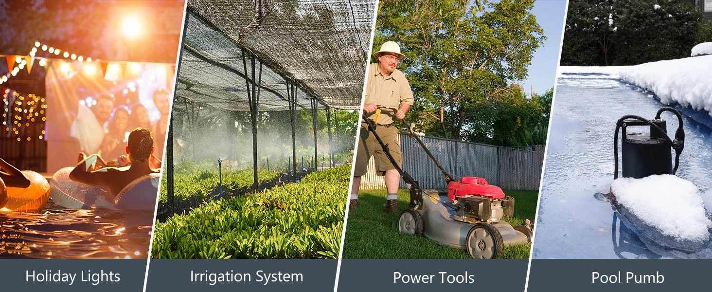 The outdoor extension cord box is ideal for a wide range of outdoor applications including outdoor extension cord, lawn and garden power tools, Christmas holiday lighting, landscape decorations, pool pumps, fountains, fish ponds, patio heaters and more outdoor electrical connections.