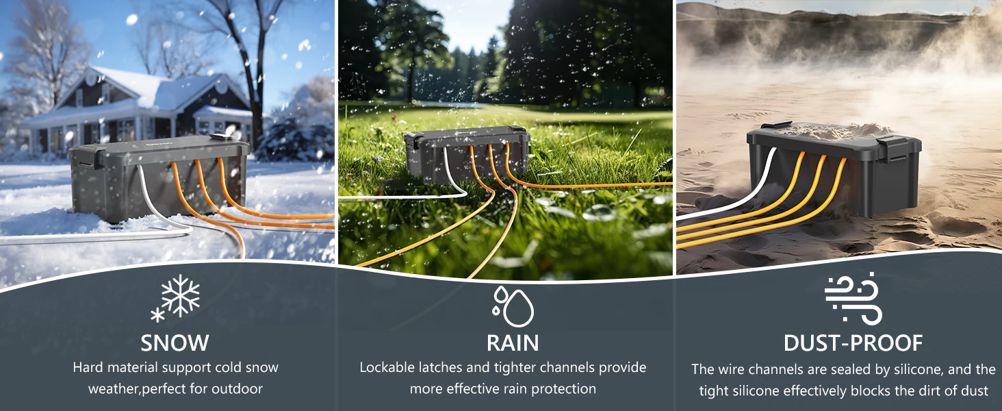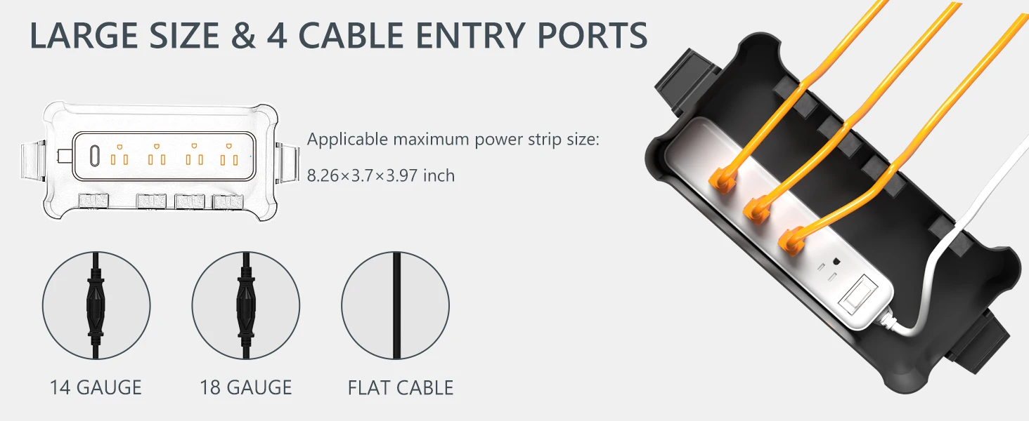 Wide Compatibility: The outdoor electrical box can protect your power strip, timer outlet, bulky adapter and more outdoor/indoor electrical connections. The 4 cable seal ports can allow maximum of 4 cords input/output. Each port is compatible with10-16A gauge cord.