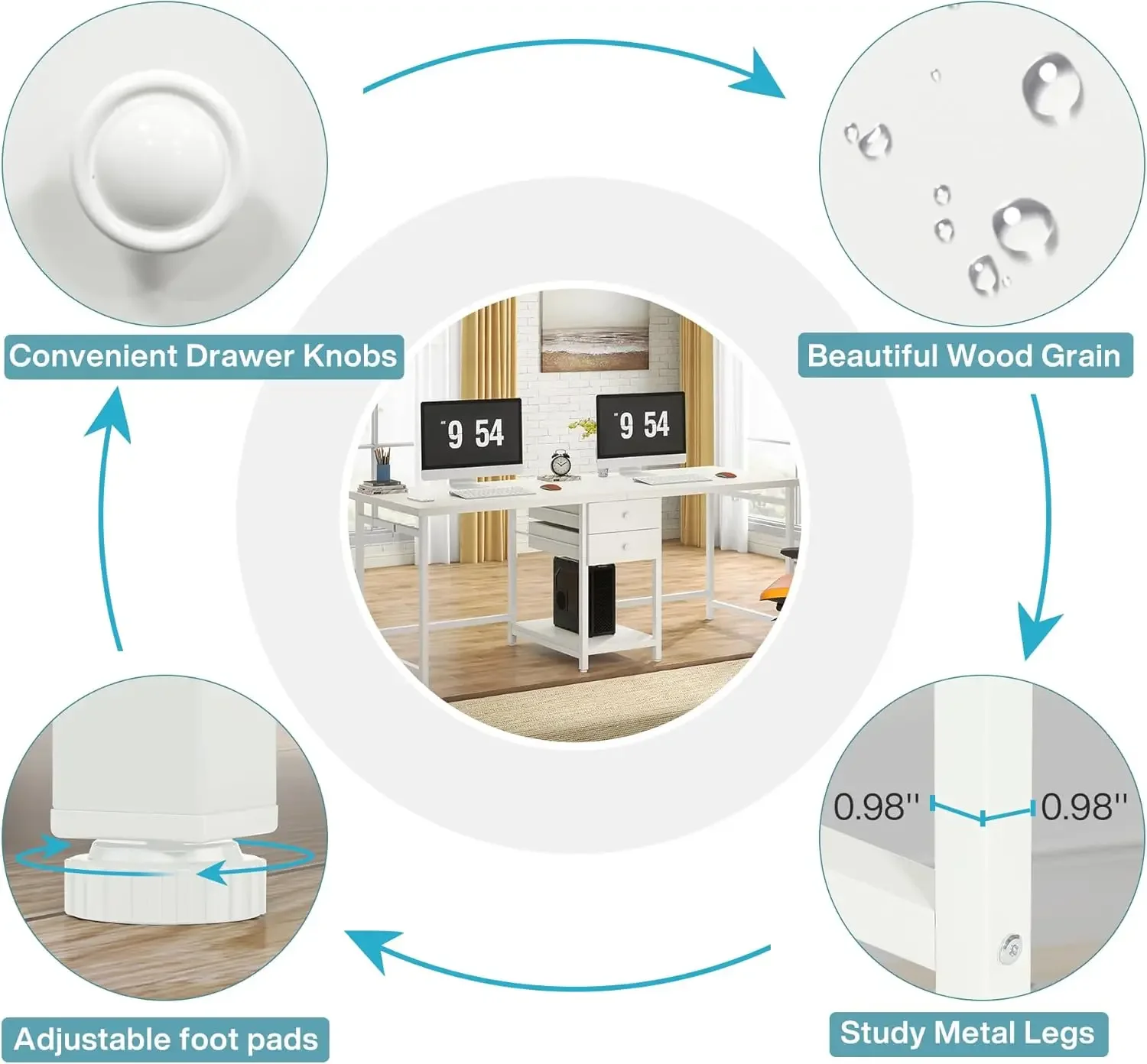 - DOUBLE DESK DESIGN: This two person desk features a double workstation with 2 drawers and storage shelf in the middle. Perfect for your classmates, colleagues, family, and you to study, play games, and work together. This long double computer desk is your perfect choice whether at home or in the office.