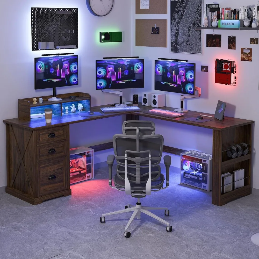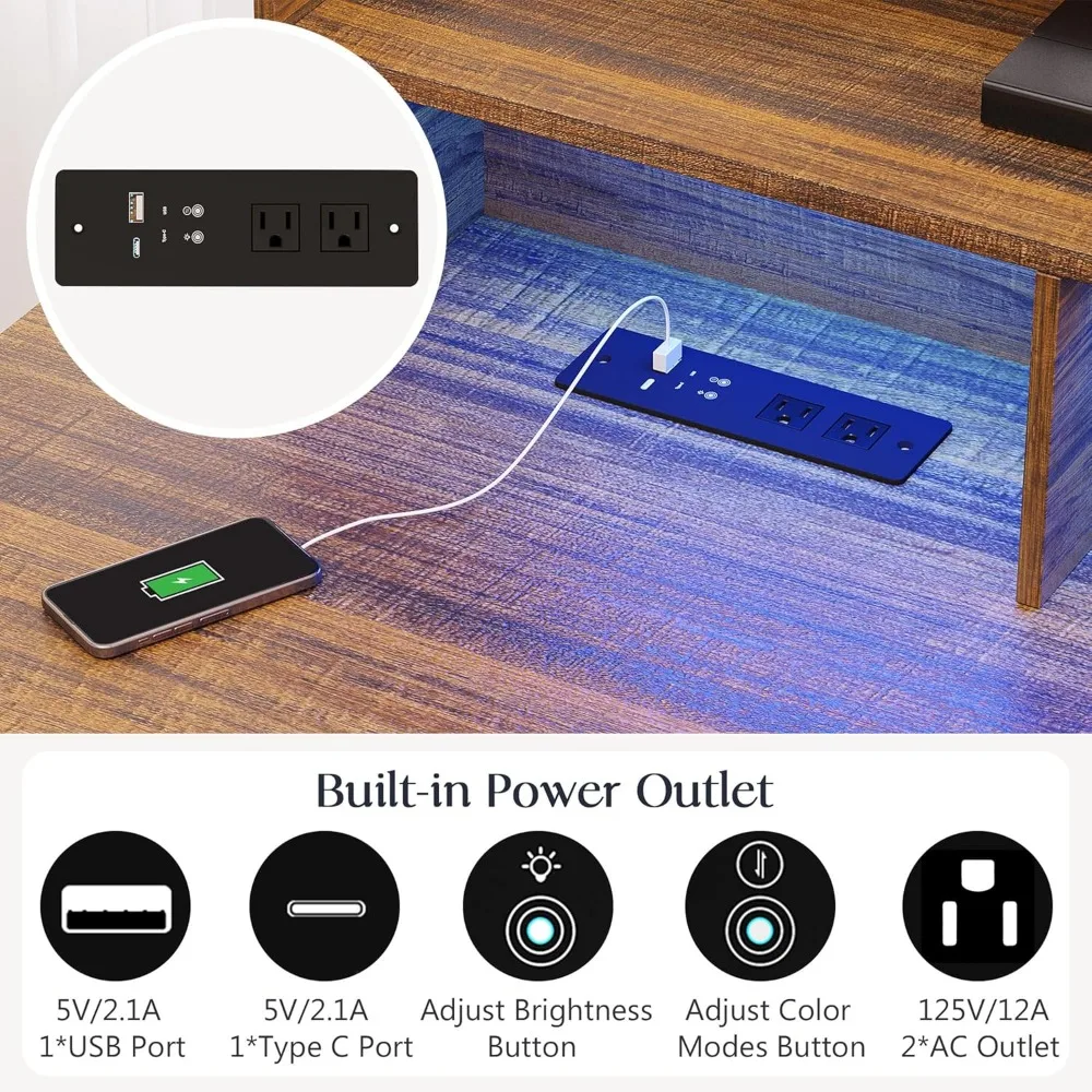 L Shaped Desk with Power Outlet - It has 2 button to adjustable brightness and color of the LED Lights, 3 color modes, as you like, to adapt to different scenes. L office desk stay powered up with 4 built-in outlets. The charging station is directly embedded in the desktop, let you use the computer to work at the same time, can also be for mobile phones, laptop charging.