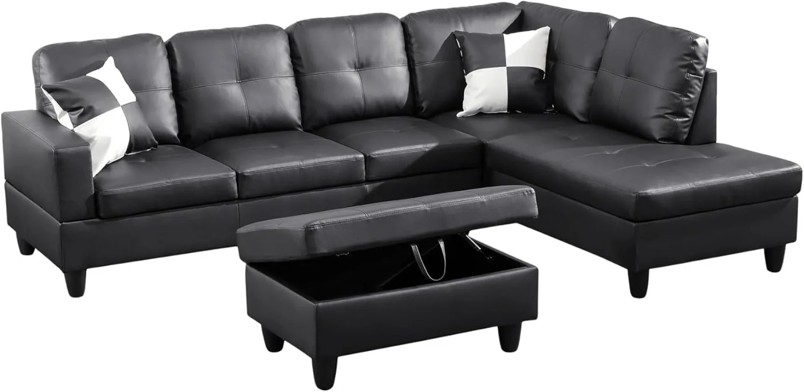 Versatile and Practical Design: The chaise lounge setup allows for flexibility in your seating arrangement, enabling you to adjust the sofa to fit your space. The included storage ottoman adds functionality, offering a handy way to keep your living area neat and orderly.