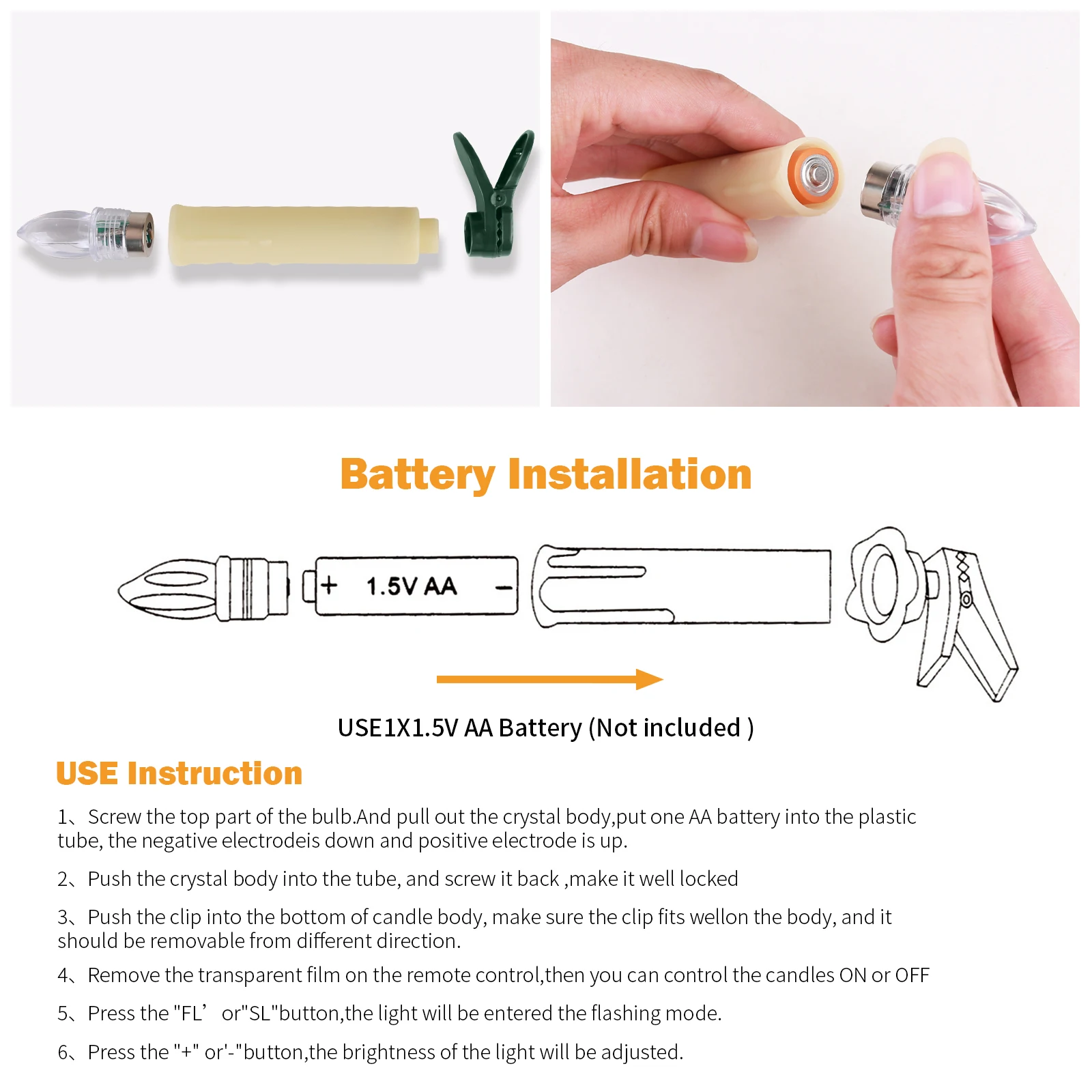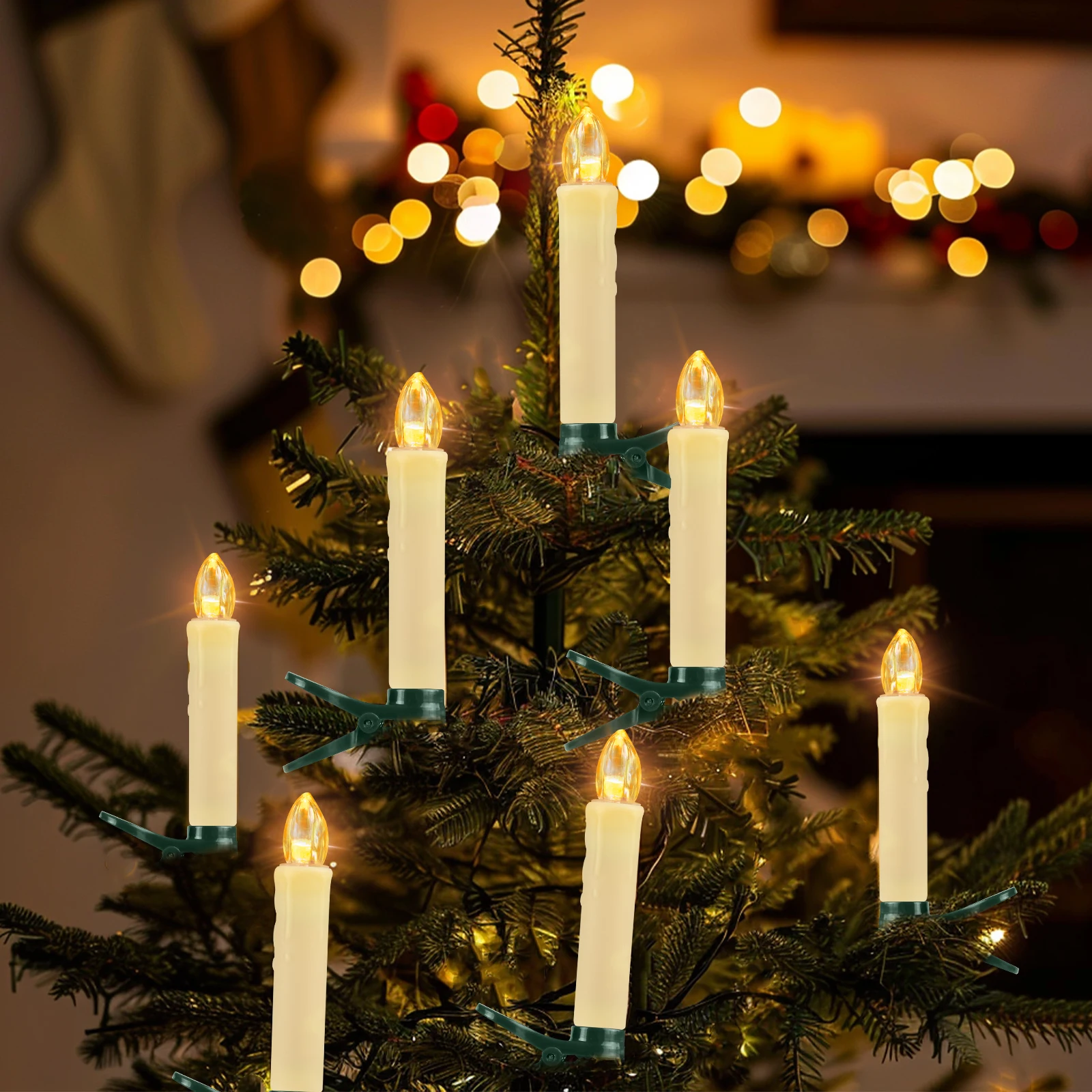 CHRISTMAS TREE ENHANCER: Adorn your Christmas tree with our set of 10/20/30/40 LED candles, each featuring a realistic dripping wax design with easy-to-attach clip.Each 1.5'' in diameter and 4.7'' in height (5" with clip), powered by 1 x 1.5V AA battery(Not included). These flameless candles double as charming ornaments, providing a warm, flickering glow that highlights surrounding decorations and adds to the tree's overall charm and visibility safely