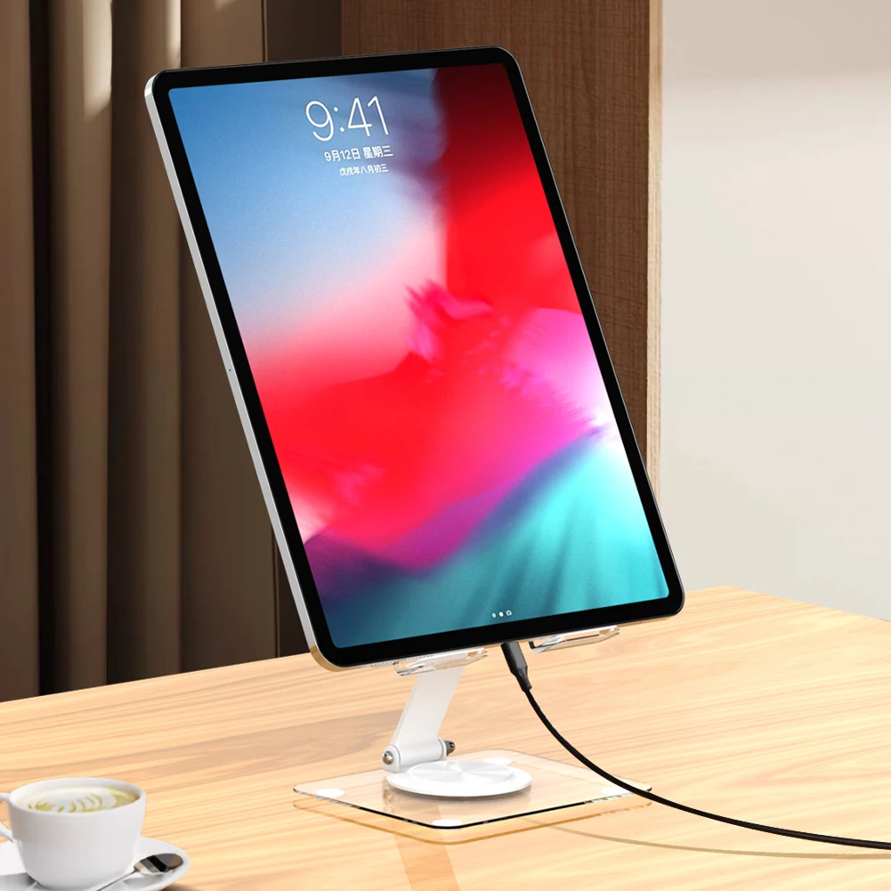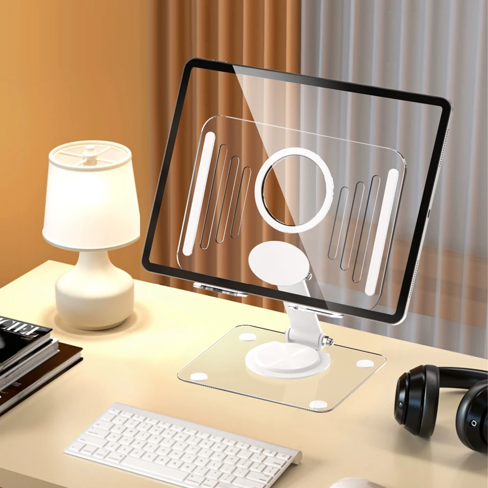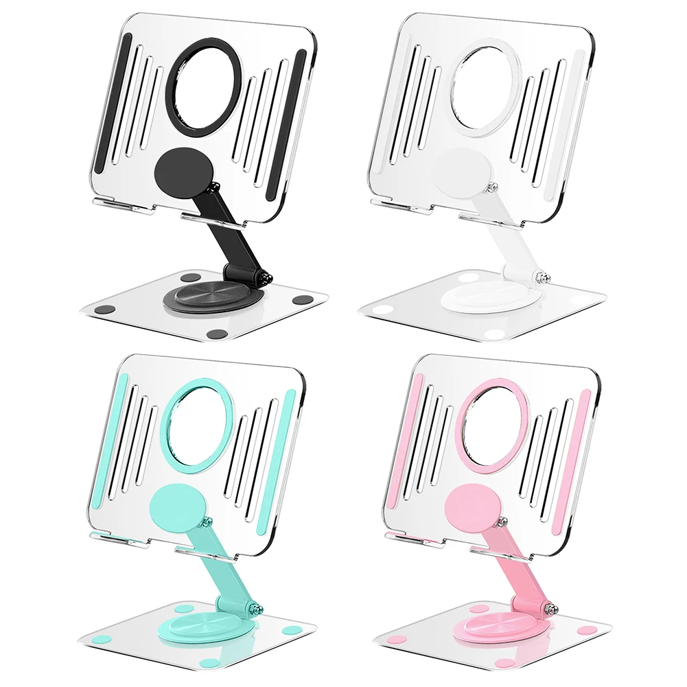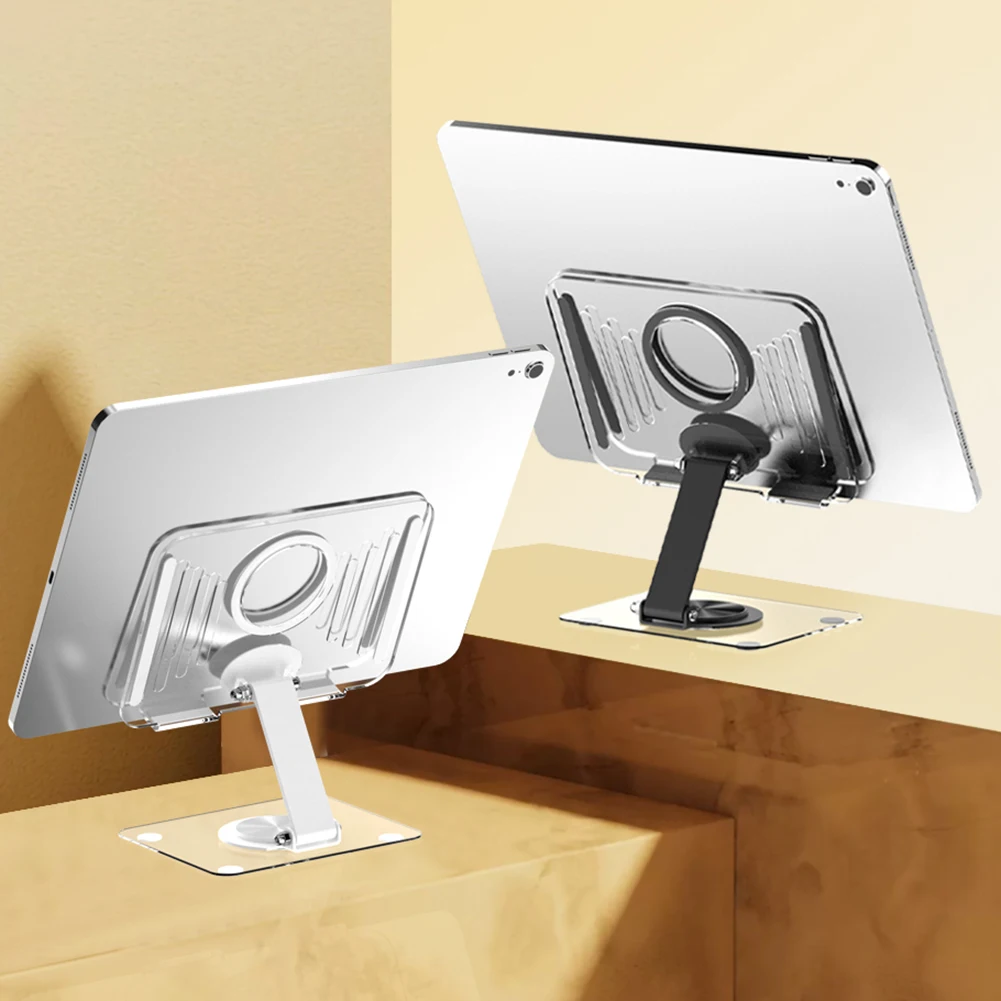 Feature: 1. 360° Flexible Rotation: Enhance your viewing experience with the tablet stand holder, featuring a 360° rotating base that allows you to easily adjust your tablet to any desired angle. Perfect for both vertical and horizontal orientations, this stand facilitates seamless scene transitions with just a simple turn. 2. Sturdy and Luxurious: Built with high-quality, thick acrylic and metal, the tablet bracket offers a crystal-clear appearance and construction. Its solid carbon steel support rod and large base ensure superior stability and weight capacity, while anti-slip pads protect your device from unnecessary movement and scratches. 3. Ergonomic Design: The tablet stand serves as an elevator, raising your tablet screen to eye level to effectively reduce neck and back discomfort during prolonged use. Whether you're standing or sitting, this stand adjusts to maintain optimal posture, making it an ideal choice for both home and office environments. 4. Compact and Foldable: Designed for easy portability, the desk stand folds down to save space, making it perfect for storing at home or carrying on the go. Fully collapsible, it fits effortlessly into backpacks, handbags, or suitcases, ready to accompany you to coffee shops, offices, or anywhere your travels take you. 5. Wide Compatibility: The transparent tablet holder is a versatile companion for work, entertainment, or everyday use, featuring extensive heat dissipation to keep your device cool. It supports a wide range of devices, including tablets like the compatible with iPad Pro 11/12.9 inches, compatible with iPad 10.9, Surface Pro, compatible with Galaxy Tab, and compatible with Xiaomi Pad, as well as smartphones up to Compatible with iPhone 15/14/13/12. Specification: Origin: Mainland China Product color: black, white, pink, green (optional) Product material: carbon steel alloy + acrylic + silicone Product process: CNC anodizing Scope of application: Applicable to all 6-13 inch tablets/mobile phones/e-books Panel thickness: 4mm Static load bearing: 3.5kg Height adjustable: 30-85mm Product size: 13x17cm Product weight: 250 grams