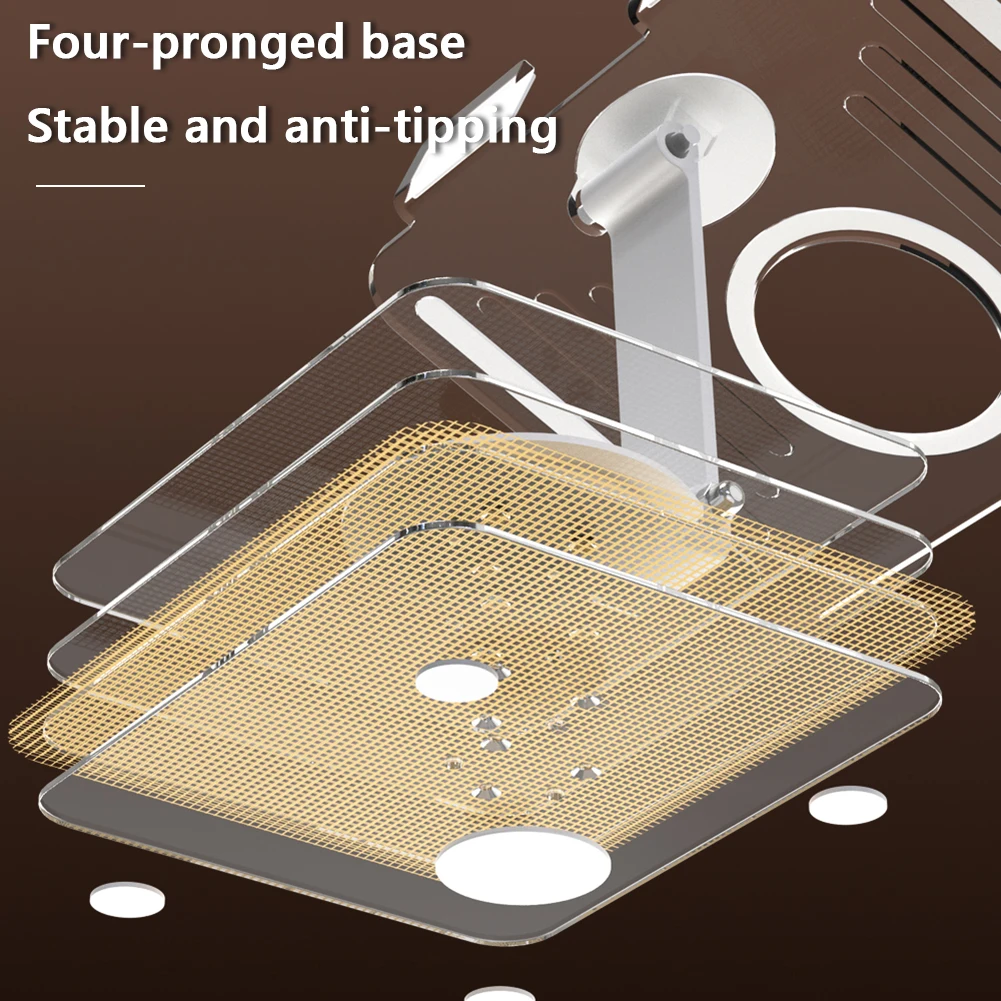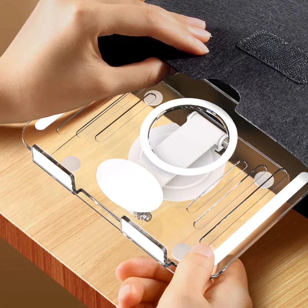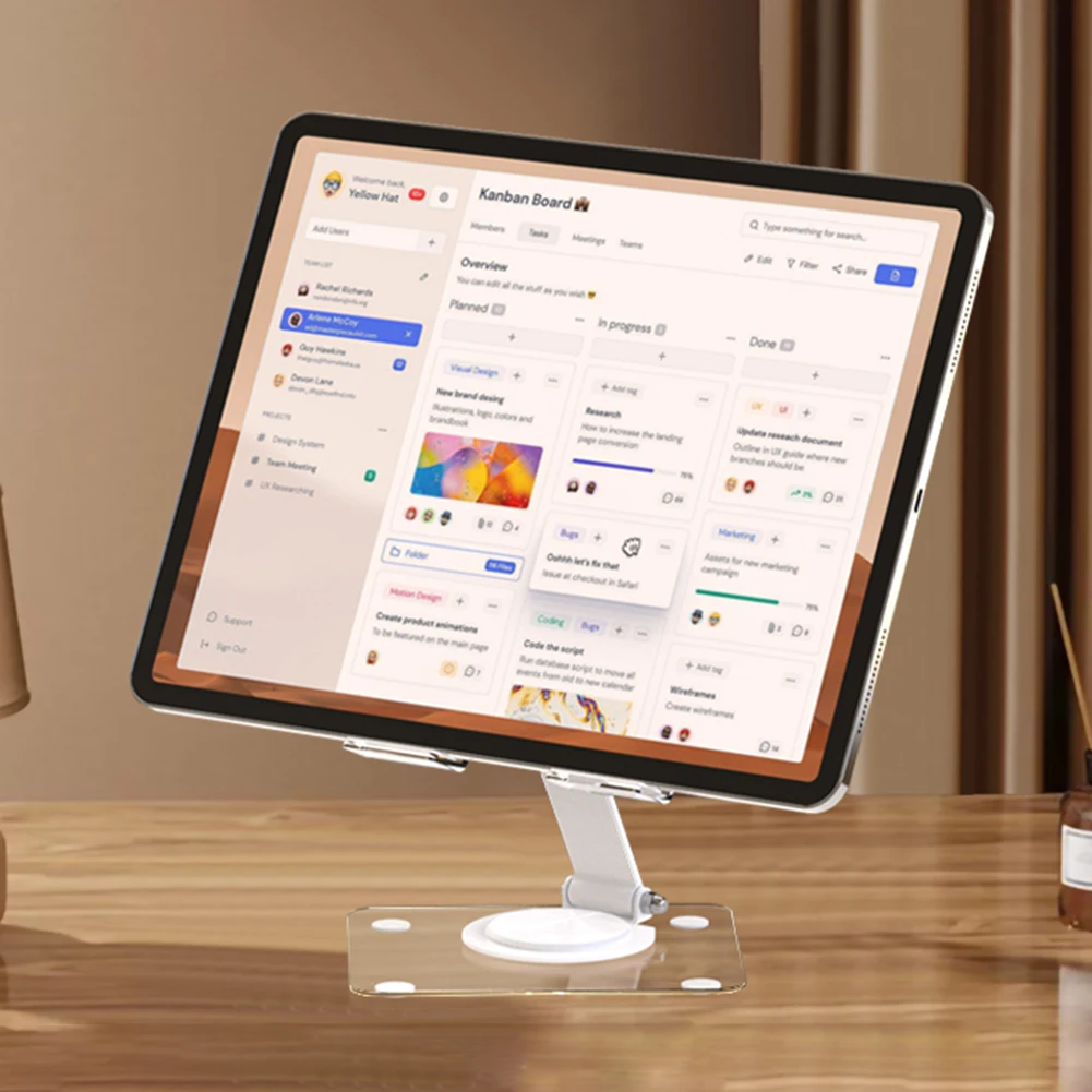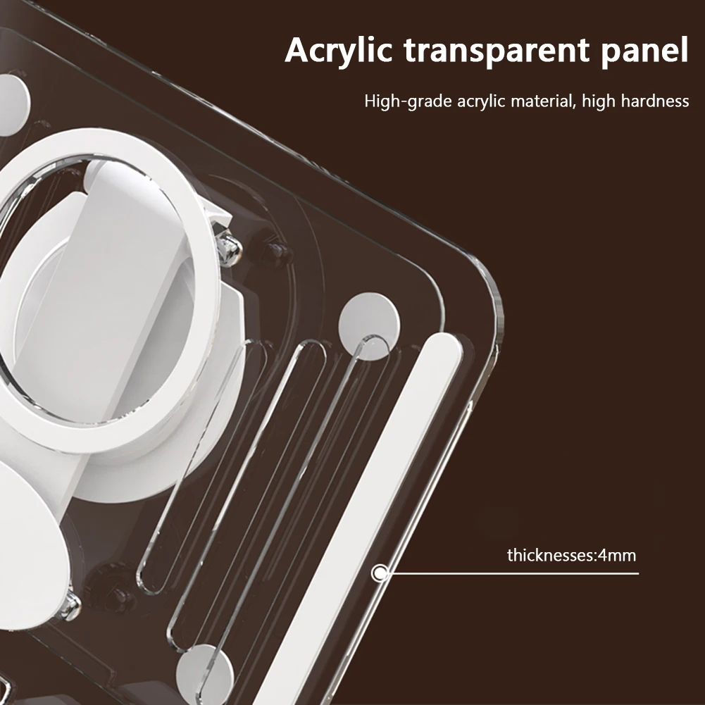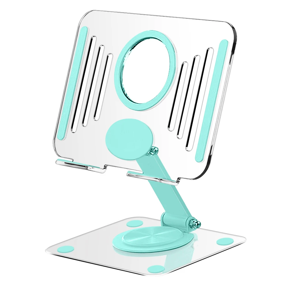 Feature: 1. 360° Flexible Rotation: Enhance your viewing experience with the tablet stand holder, featuring a 360° rotating base that allows you to easily adjust your tablet to any desired angle. Perfect for both vertical and horizontal orientations, this stand facilitates seamless scene transitions with just a simple turn. 2. Sturdy and Luxurious: Built with high-quality, thick acrylic and metal, the tablet bracket offers a crystal-clear appearance and construction. Its solid carbon steel support rod and large base ensure superior stability and weight capacity, while anti-slip pads protect your device from unnecessary movement and scratches. 3. Ergonomic Design: The tablet stand serves as an elevator, raising your tablet screen to eye level to effectively reduce neck and back discomfort during prolonged use. Whether you're standing or sitting, this stand adjusts to maintain optimal posture, making it an ideal choice for both home and office environments. 4. Compact and Foldable: Designed for easy portability, the desk stand folds down to save space, making it perfect for storing at home or carrying on the go. Fully collapsible, it fits effortlessly into backpacks, handbags, or suitcases, ready to accompany you to coffee shops, offices, or anywhere your travels take you. 5. Wide Compatibility: The transparent tablet holder is a versatile companion for work, entertainment, or everyday use, featuring extensive heat dissipation to keep your device cool. It supports a wide range of devices, including tablets like the compatible with iPad Pro 11/12.9 inches, compatible with iPad 10.9, Surface Pro, compatible with Galaxy Tab, and compatible with Xiaomi Pad, as well as smartphones up to Compatible with iPhone 15/14/13/12. Specification: Origin: Mainland China Product color: black, white, pink, green (optional) Product material: carbon steel alloy + acrylic + silicone Product process: CNC anodizing Scope of application: Applicable to all 6-13 inch tablets/mobile phones/e-books Panel thickness: 4mm Static load bearing: 3.5kg Height adjustable: 30-85mm Product size: 13x17cm Product weight: 250 grams