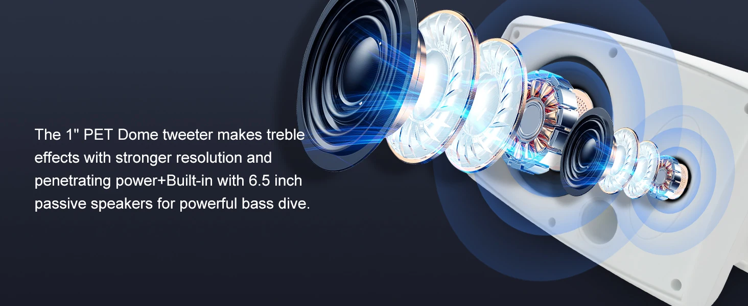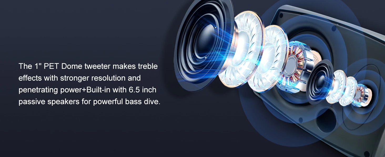 【6.5-inch Woofer & Tweeter】: Combining a high-quality 6.5-inch woofer for deep, rich bass and a precision tweeter for crisp highs, it offers a balanced and detailed soundstage.