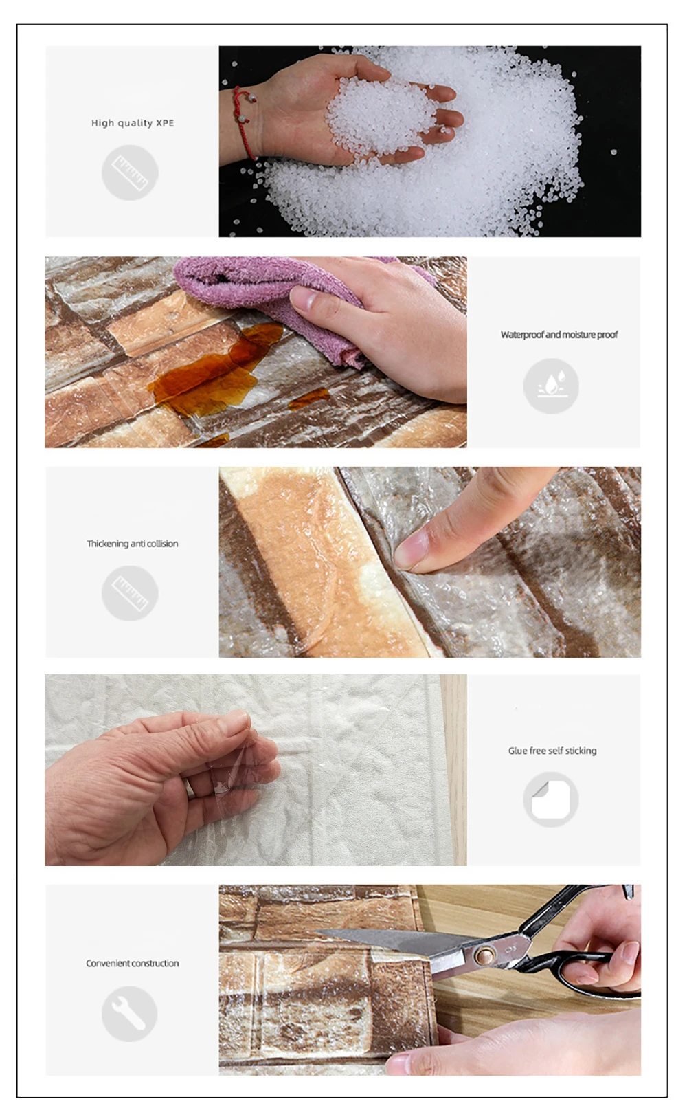 A:The wall paper is made of XPE foamed material, which is anti-collision, anti-fouling, waterproof, environmentally friendly and has no peculiar smell.