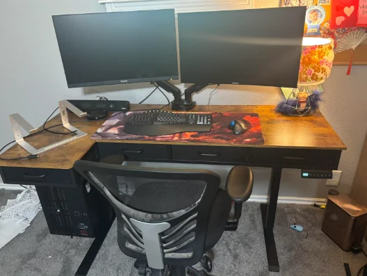 - L-Shaped Workspace: The standing desk L shape fits in the corner of a room, effectively saving space for rooms with limited space. There's a tray behind the sit stand desk to help you keep your cables tidy, maintaining an aesthetically desktop