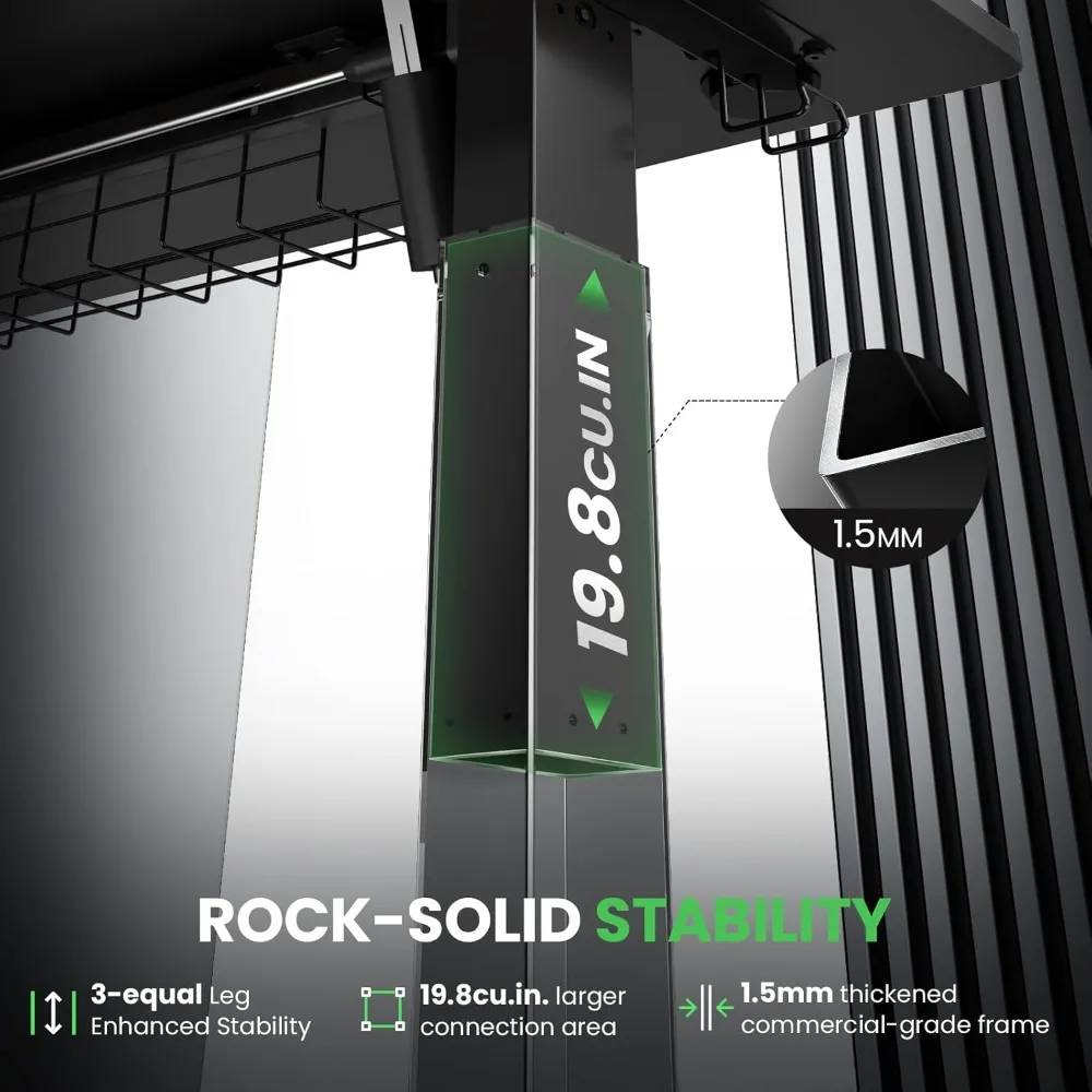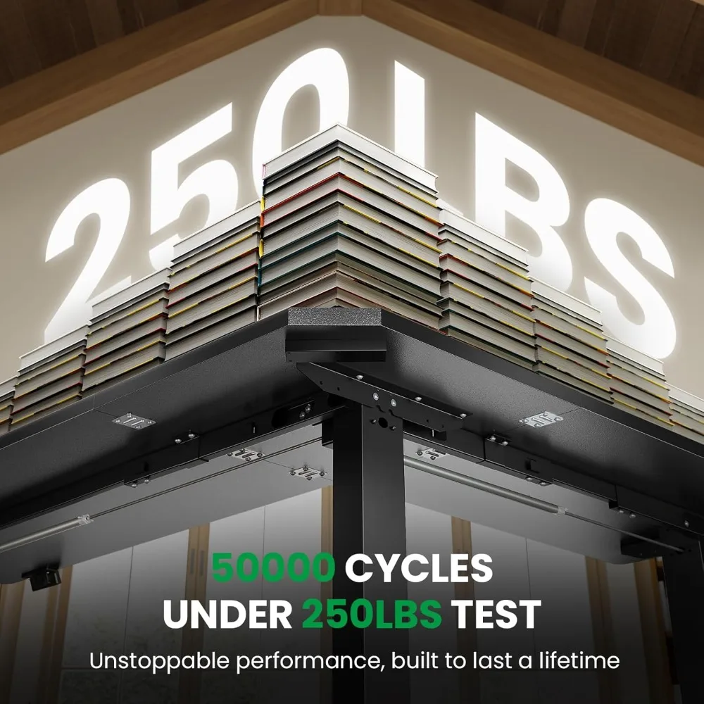 - 【Solid and Durable】The L-shaped electric standing desk features a durable and wear-resistant tabletop paired with three equal-length legs . During a 250LBs load-bearing test, the motor can smoothly perform 50,000 lifting and lowering cycles. L-shaped standing desk — Redefining the lifecycle of office furniture through industrial-grade durability