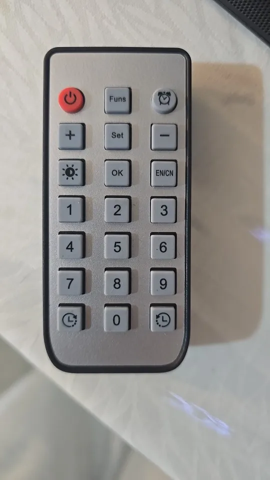 The clock is very beautiful, its size is suitable, it works with electricity or battery, comes with a remote control and has an alarm. You can control its lighting, and it also shows the day, date, temperature, and humidity. The remote has both English and Chinese languages.