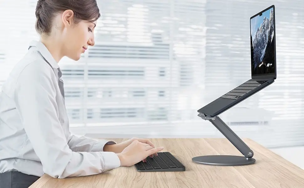 Heat Dissipation: The design with heat vent improves airflow around and under the laptop. In addition, its 100% aluminum alloy body also helps to diffuse heat to cool down your laptop. Keeping your laptop cool is the key to prolonging its service life. Using a laptop stand for desk will raise your laptop from a flat surface, which allows natural air to continuously cool your laptop and prevent it from overheating.