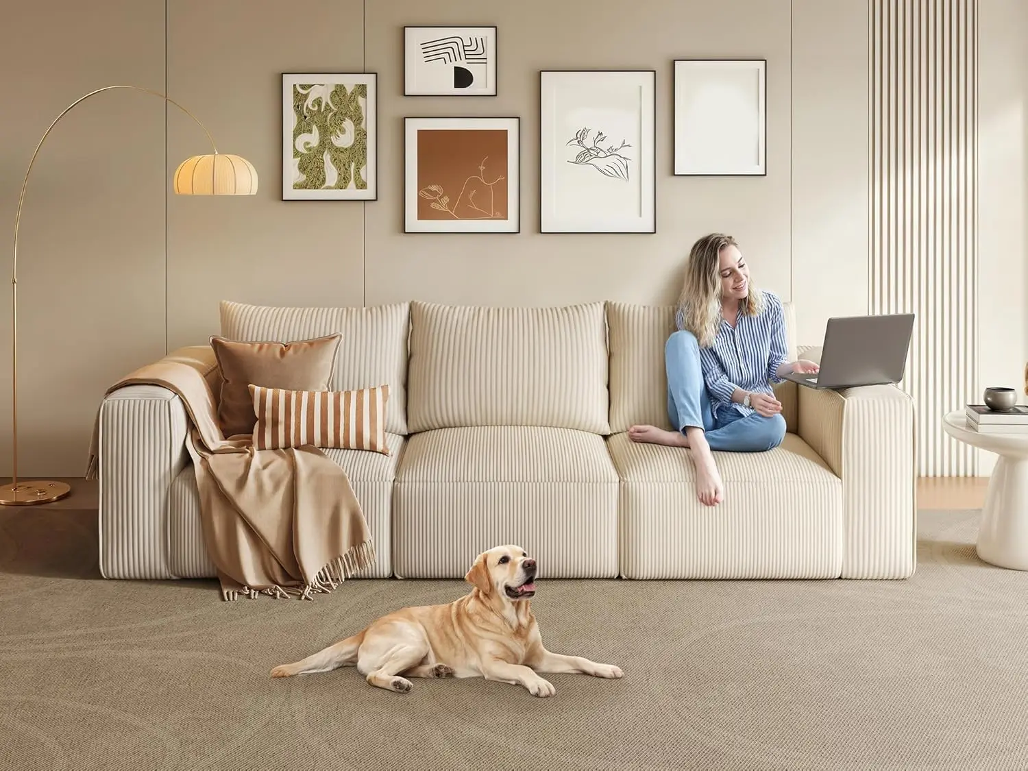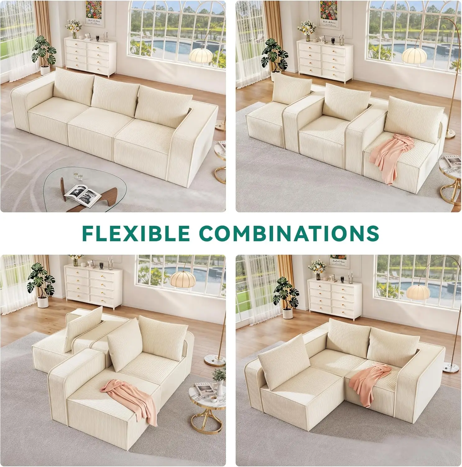 This sectional couch is designed for seamless space adaptation, allowing you to easily transform it from a sofa to a bed. It's perfect for various settings such as living rooms, apartments, guest rooms, or bedrooms. Enjoy the dreamy comfort of deep 29.13-inch seats with plush 30D high-resilience foam cushions, along with three pillows for adaptable back or head support, ensuring great coziness. The elegant corduroy finish with a soft, wrinkle-resistant texture and striped design adds a stylish and luxurious touch to your space. The practical wide armrests, measuring 9.8 inches, are ideal for resting your arms or keeping your everyday essentials like phones, remotes, or tablets within easy reach. This corduroy sectional couch is convenience-oriented, requiring no assembly and expanding optimally in 72 hours. It features anti-slip particles and interlocking clips for stability over time. Please note that this couch arrives in three separate boxes, which may be delivered at different times. If you have any inquiries or need assistance with your cloud couch, feel free to contact us promptly.