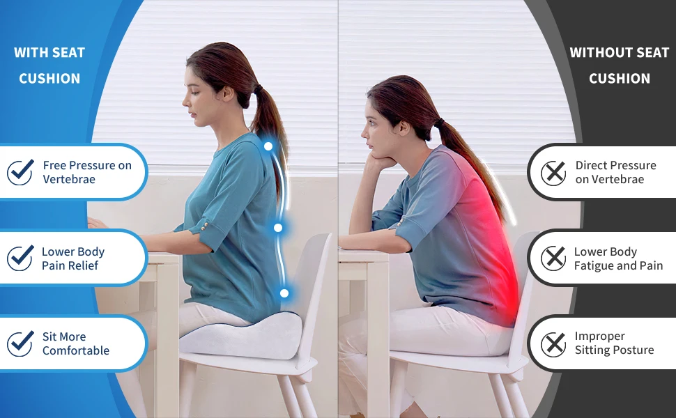 【Relieve Fatigue】The office chair cushions can relieve body soreness and improve posture. A poorly designed chair puts unnecessary stress on your lower back, hips, tailbone and thighs, causing you to sit improperly. Our ergonomic chair cushions can help relieve some of the stress by distributing the weight load on the seat cushion, making your body feel more relaxed.