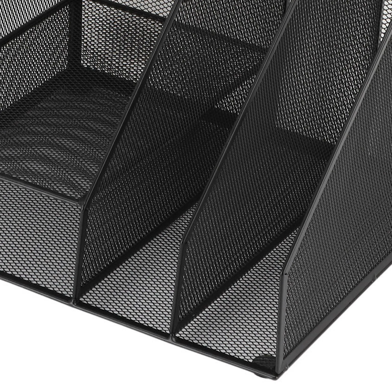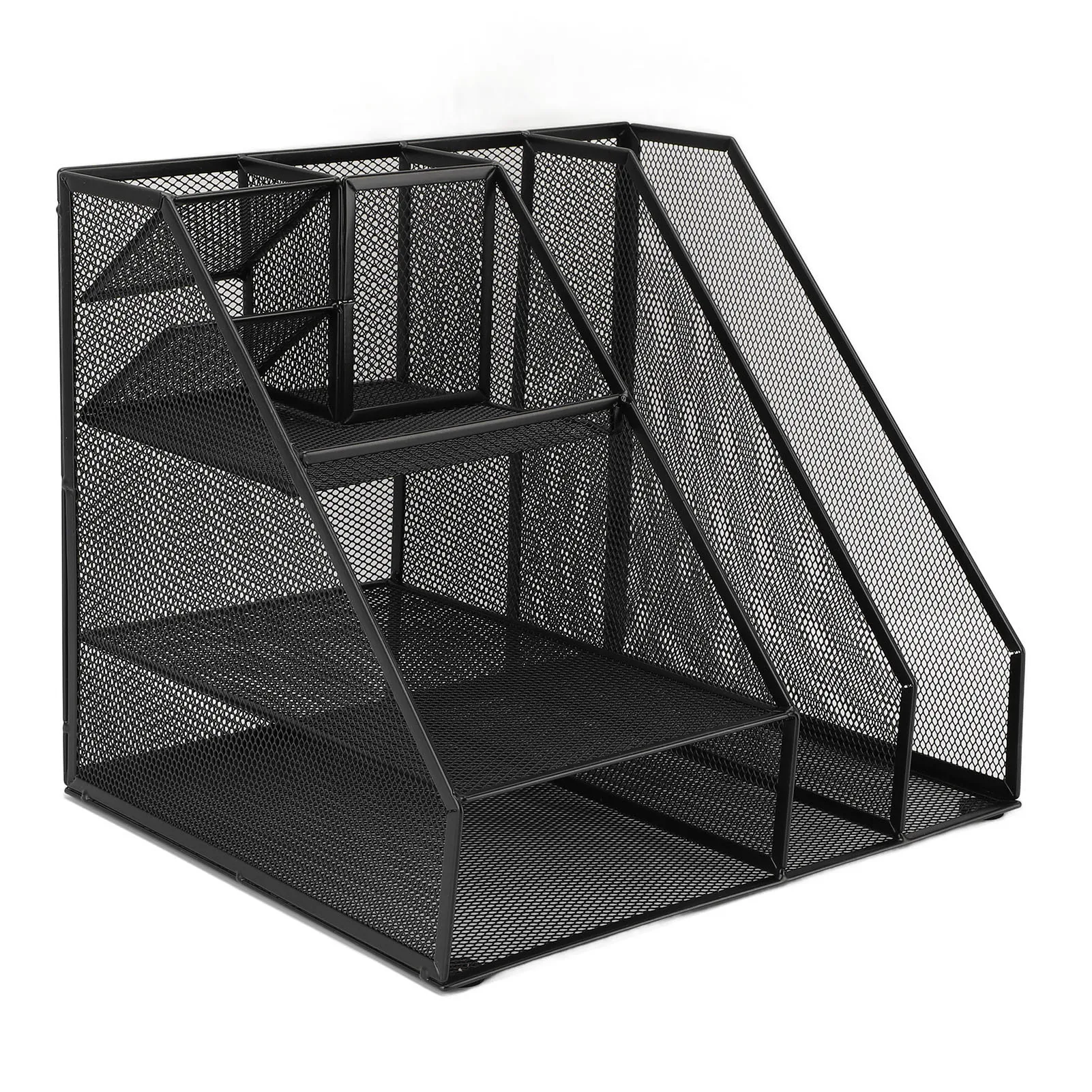 1. Versatile Storage Solution: This mesh desktop organizer file sorter allows you to combine multiple separate organizers into one cohesive unit, effectively decluttering your work space. It is suitable for organizing small office supplies and provides ample storage space for documents, making it an essential tool for maintaining order and efficiency in any setting.2. Rugged And Lightweight Construction: Made from a lightweight iron mesh structure with a solid base, this metal mesh desktop organizer offers high strength and durability. The powder coated finish is safe, ensuring that your work space remains safe while maintaining a slick aesthetic. The stable design prevents sliding or wobbling during use, providing a good storage option.