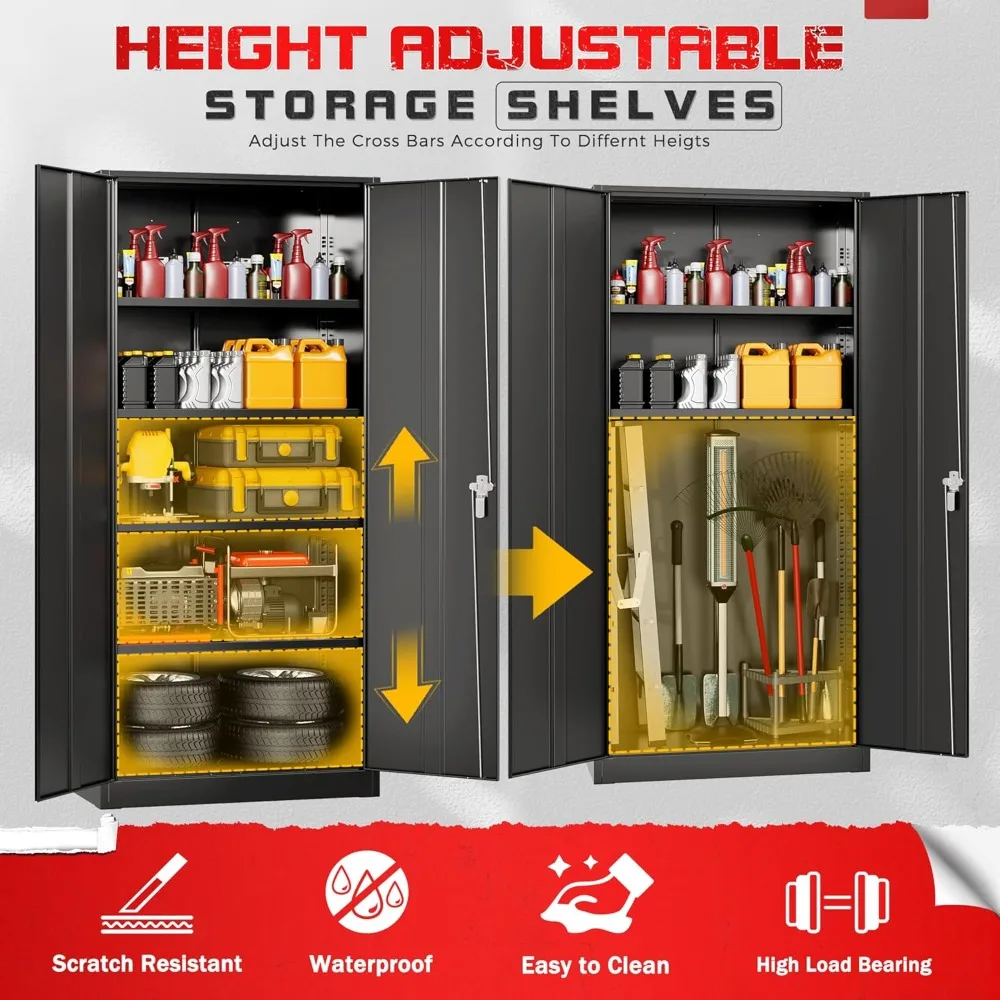 - 【Multifunctional large cabinet】 72-inch garage storage cabinet with doors and shelves. Each shelf of the garage cabinets can withstand a weight of 180 lbs. The adjustable shelves board can meet your storage needs for items of different sizes, which will bring more convenience. Lockable garage storage system cabinet is suitable for different locations, such as home offices, garages, pantry, Kitchen, tool room, classrooms.