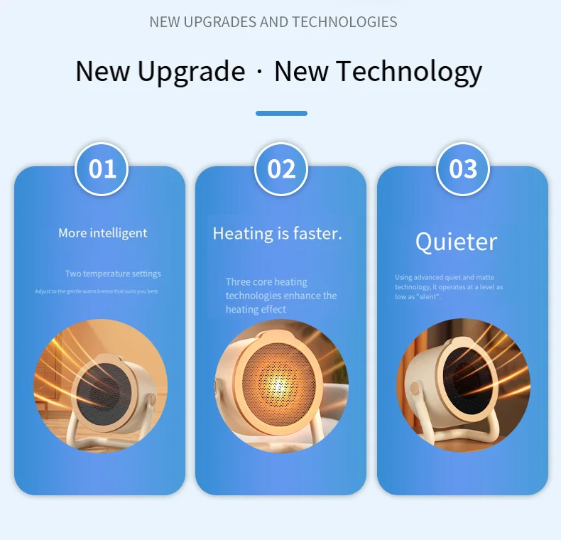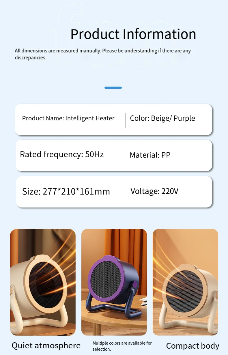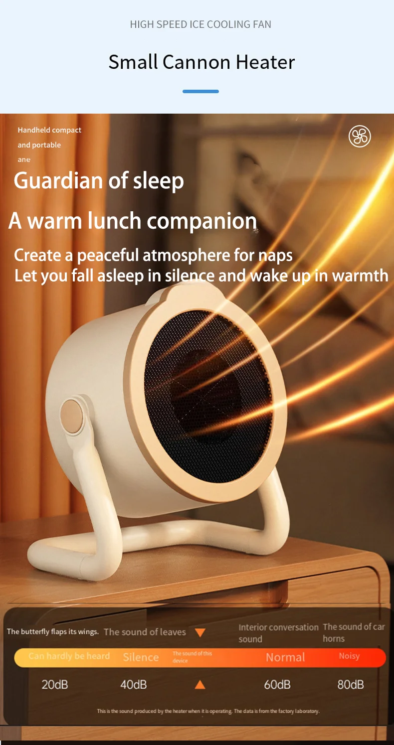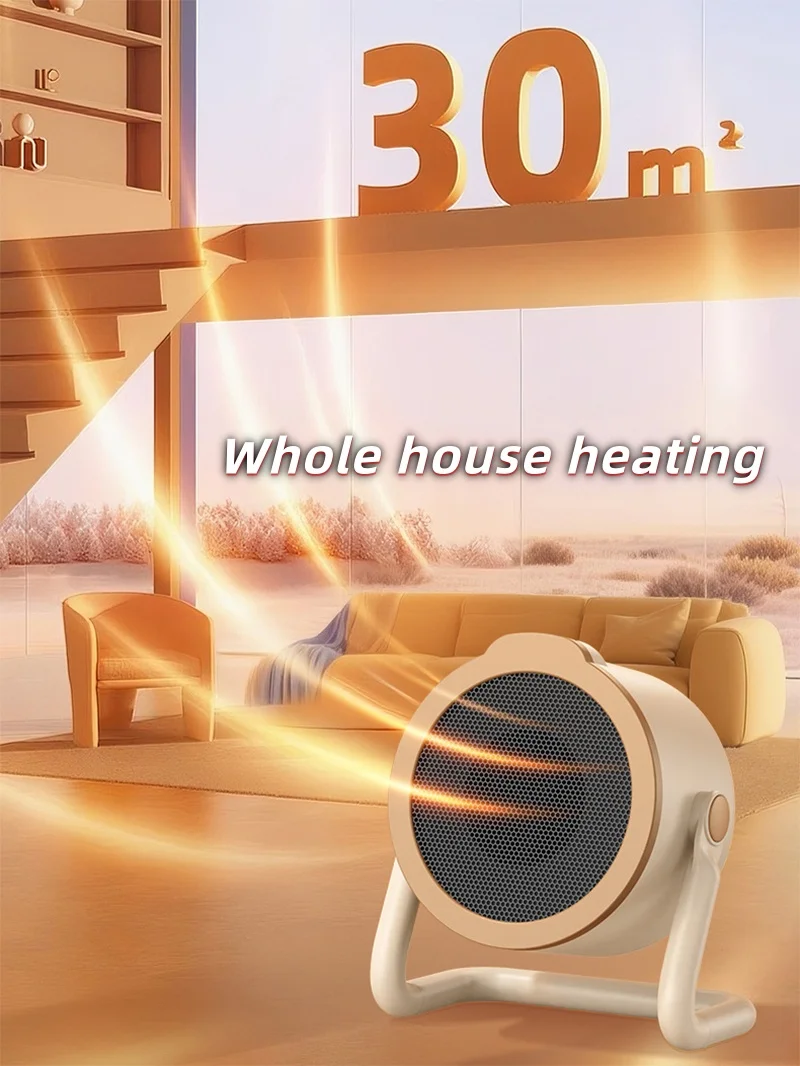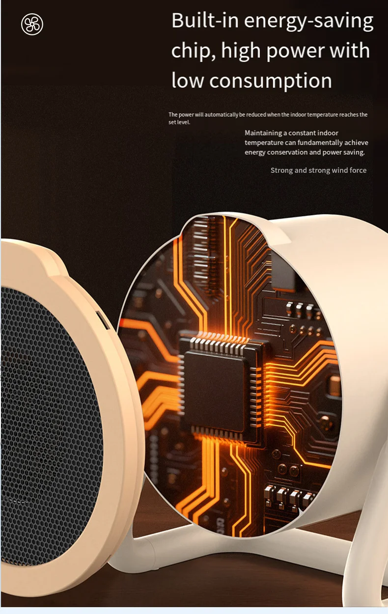 Product features: fast heating, silent operation, wide-angle airflow, energy-saving, high temperature resistant metal grille, high temperature automatic shutdown, safety protection