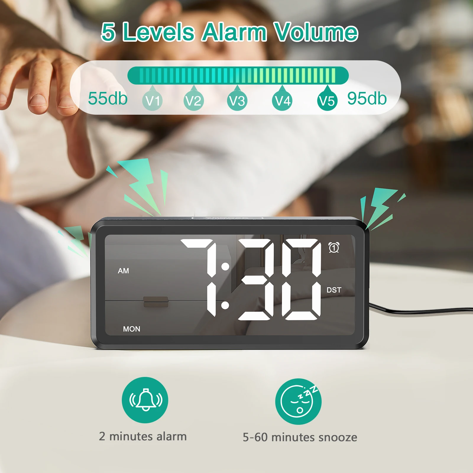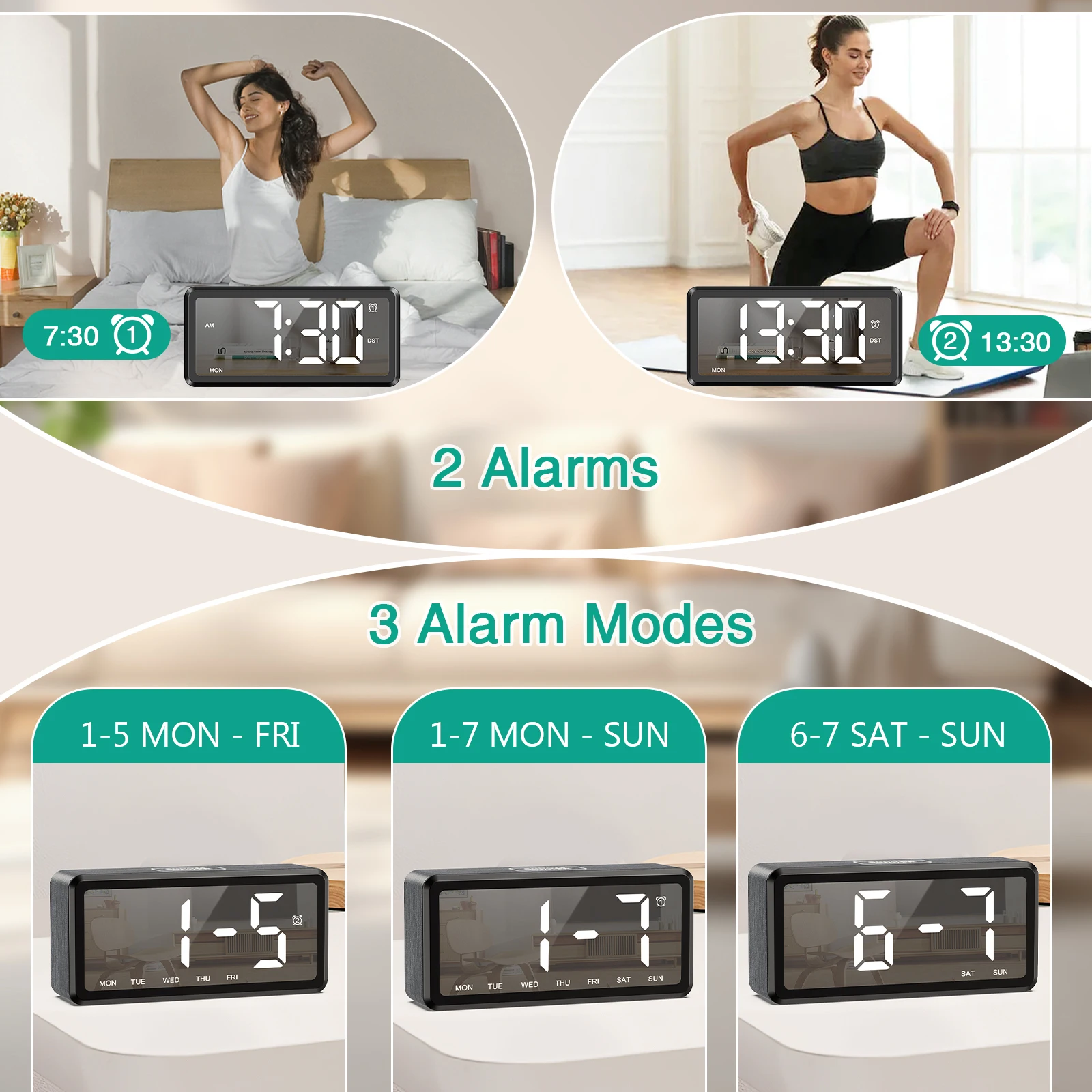 【Flexible Alarm Settings】: Set up to two alarms with three different weekly alarm options: Weekdays (Mon-Fri), Daily (Mon-Sun), or Weekends (Sat-Sun). Additionally, the Snooze function allows you to delay the alarm from 5 to 60 minutes, with unlimited snooze attempts.