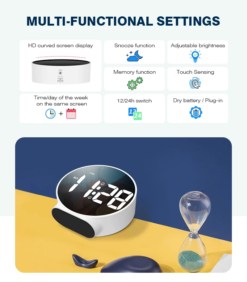 ✔️ Ultra-Clear Curved LED Screen: Large high-definition display with curved design ensures effortless time reading. Intuitive back-mounted buttons for easy operation.