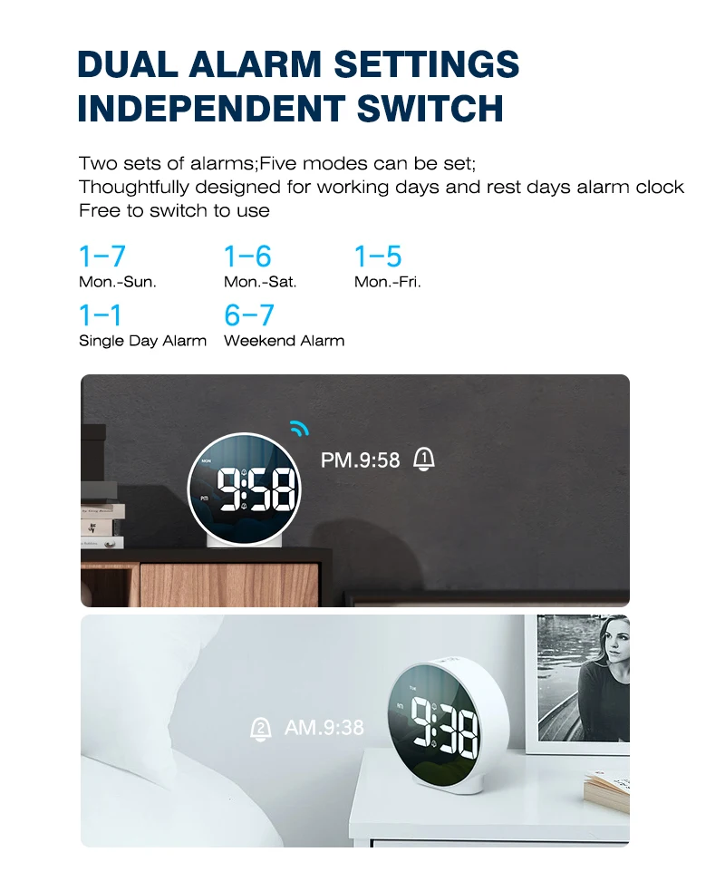 ✔️ Customizable Alarms: Set two independent alarms (on/off freely) with snooze (5-minute default). Perfectly tailored for weekdays, weekends, holidays, or unique schedules.